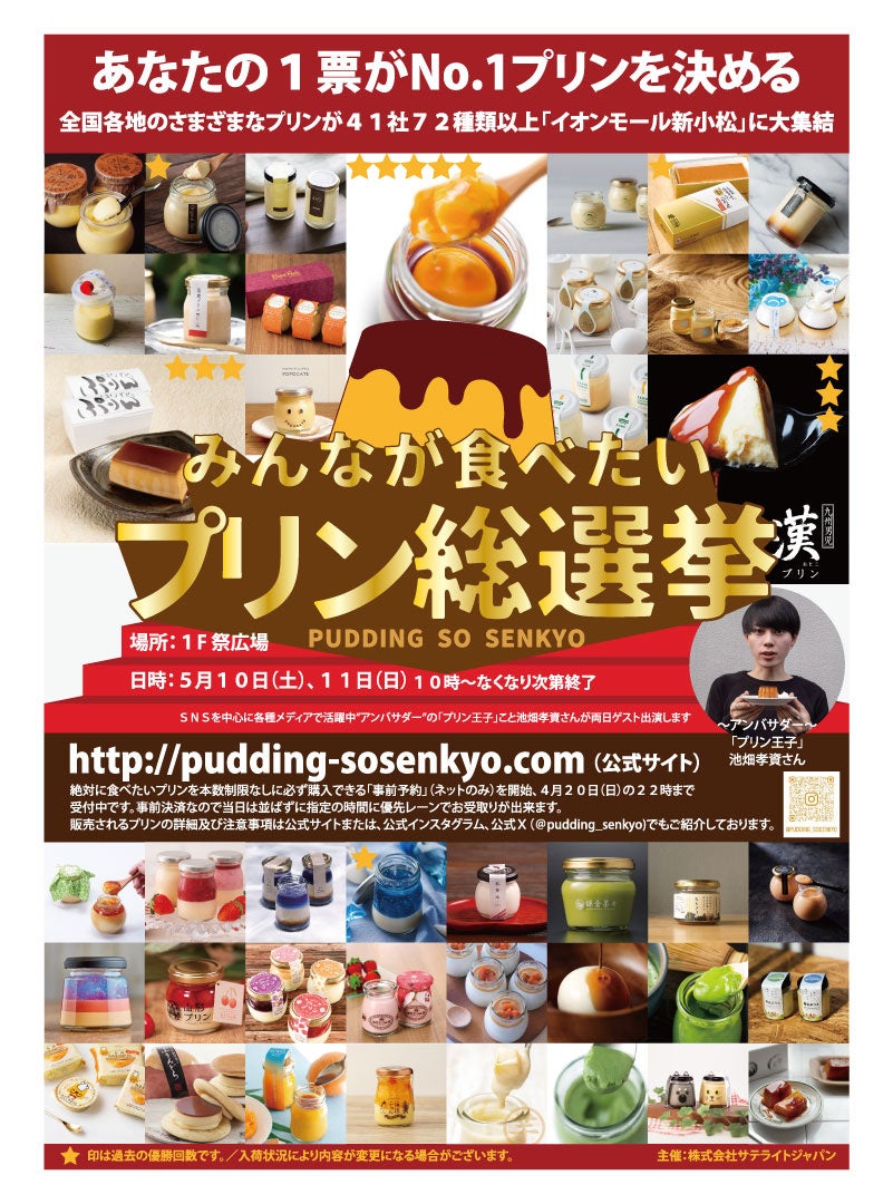 関西及び東海・関東地方中心にイベントの企画・運営を展開する株式会社サテライトジャパン(本社:兵庫県芦屋市)は、イオンモール新小松(運営:イオンモール株式会社)にて”北海道から九州まで全国各地のさまざまなプリンが大集結する”「第15回みんなが食べたいプリン総選挙」を2025年5月10日(土)、11日(日)の2日間の日程で開催します。