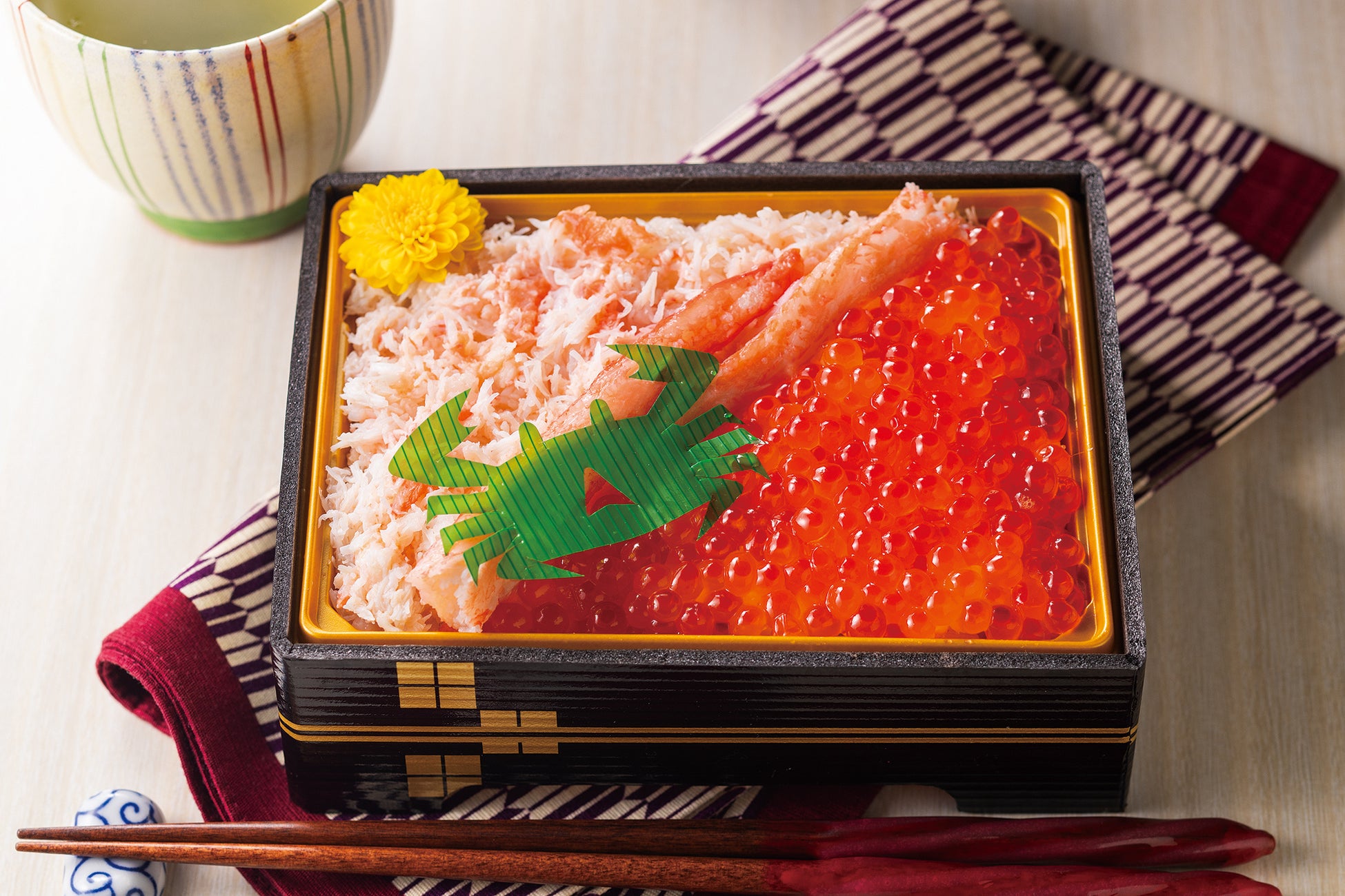 福井県産紅ずわいがにと北海道産いくら をたっぷりのせた、今回の福井フェアだ けの限定品。本ずわいがにに勝るとも劣 らない味わいとされている紅ずわいがに を贅沢に使用しています。