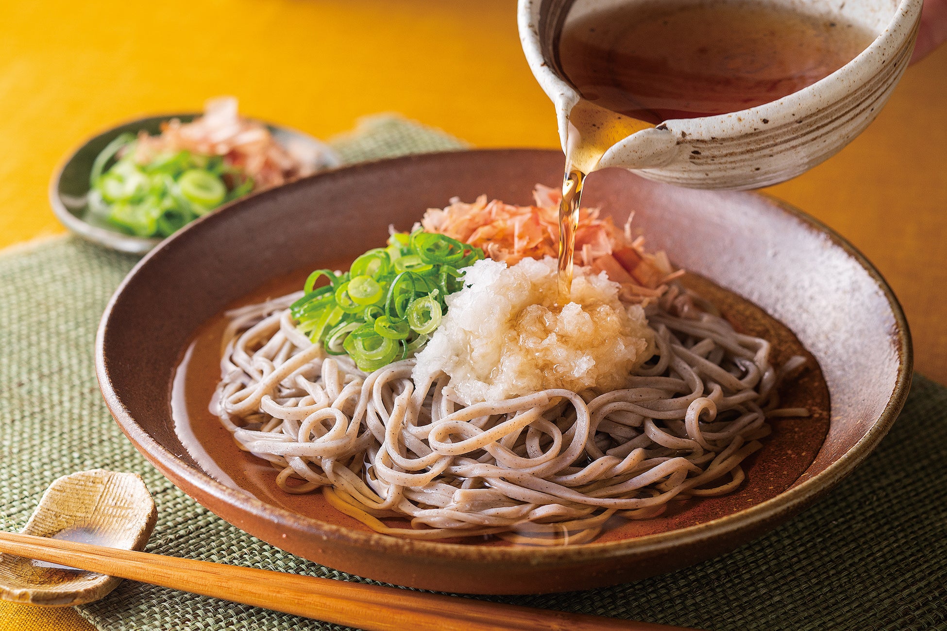 福井県内の自社農場で栽培しているそばを使用。水分の多い越前で獲れたそば粉は、しっとりすべすべ滑らかで甘味・旨味が格段に違うと言われています。雨が多い分収穫量などは多くはありませんが、その分越前そばは噛むほどに甘く、もっちりとした食感をお楽しみいただける極上の逸品です。