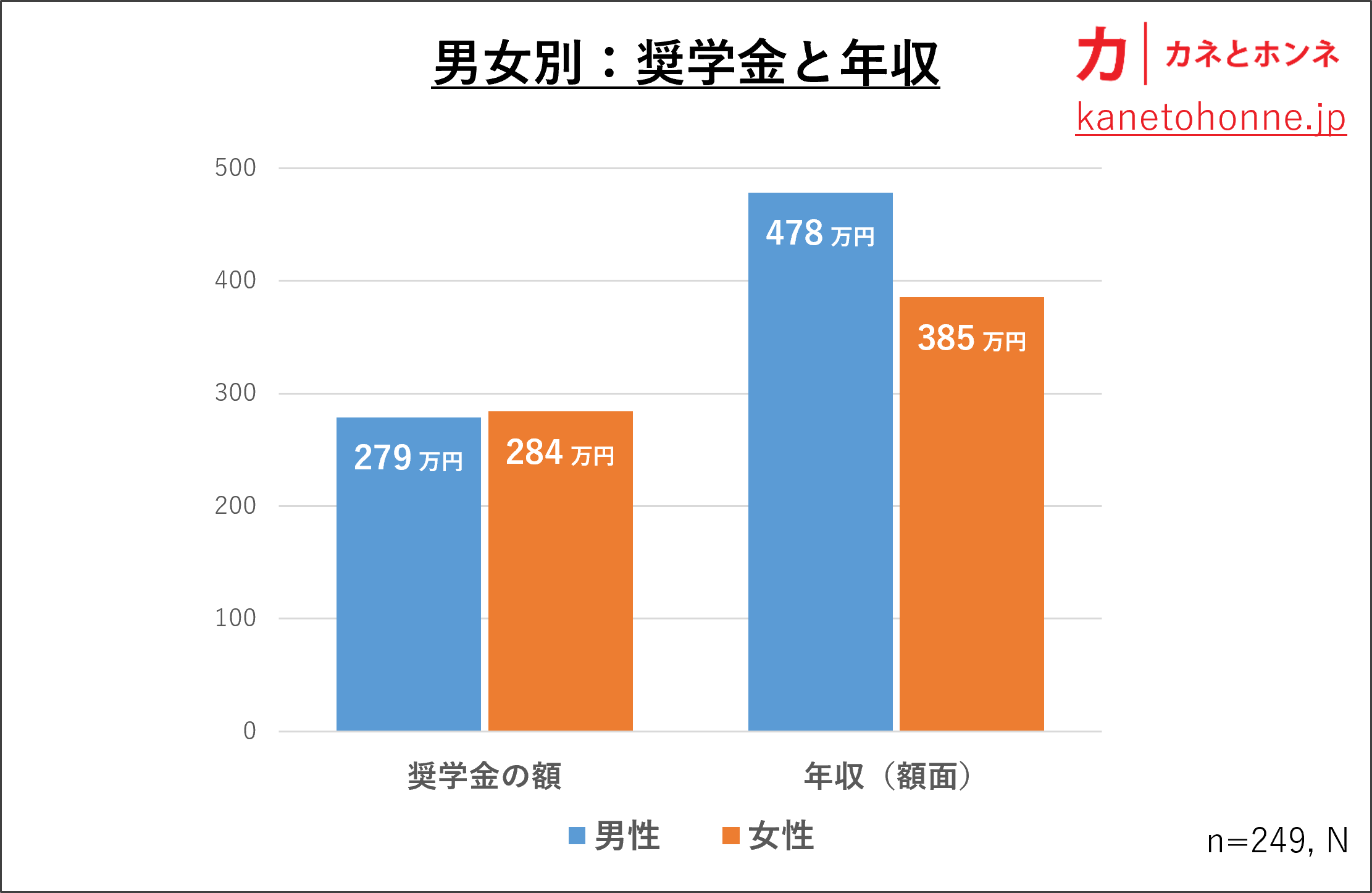 奨学金の額は男性が279万円、女性が284万円とほとんど変わりません。つまり、学業を修めるにあたり、金銭的に支援が必要な額は男女で変わりがないということです。教育にかかるコストは男女で同じだと言い換えても良いでしょう。しかし、年収は男性が478万円であるのに対し、女性は385万円に過ぎません。男性の年収は女性より24%多い計算となります。10年のキャリアによる年収アップの18%を超えているのです。多大なコストを払ってきた女性からすると、とても納得いかないでしょう。