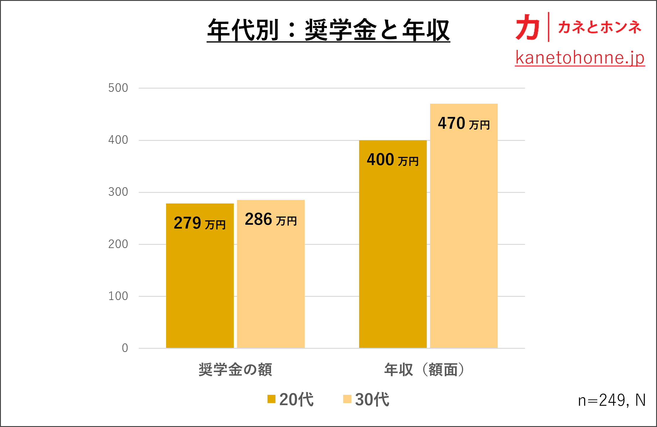 次に、奨学金を借りた人にその年収を聞きました。年代別にみた場合、奨学金の額はあまり変わりませんが、年収は20代が400万円のところ、30代が470万円でした。年齢にともなってキャリアが形成され、その結果、年収があがったのでしょう。10年のキャリアで年収が18%あがった計算となります。それよりも、問題は男女差です。