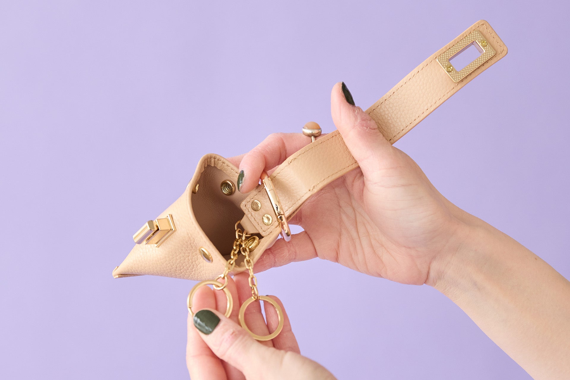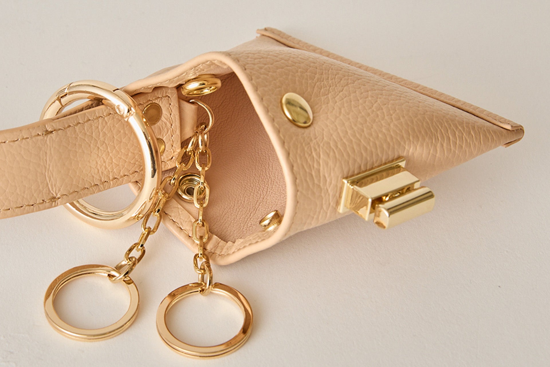 シボ感のある牛革とゴールド金具の相性が良く、普段使いのバッグに付けるだけでガラリと大人っぽく印象チェンジできる、クラシカルかつ上品なアイテムです。
