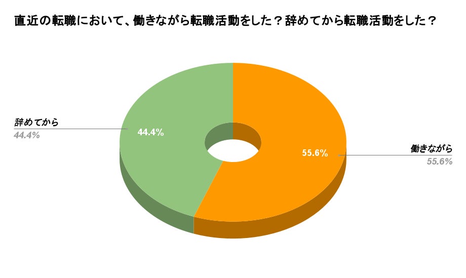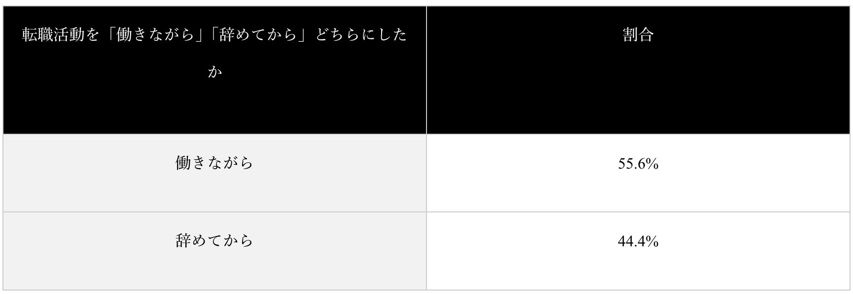 「働きながら」転職活動をした人は55.6%と半数以上を占める一方で、「辞めてから」転職活動をした人も44.4%にのぼり、大差はありませんでした。