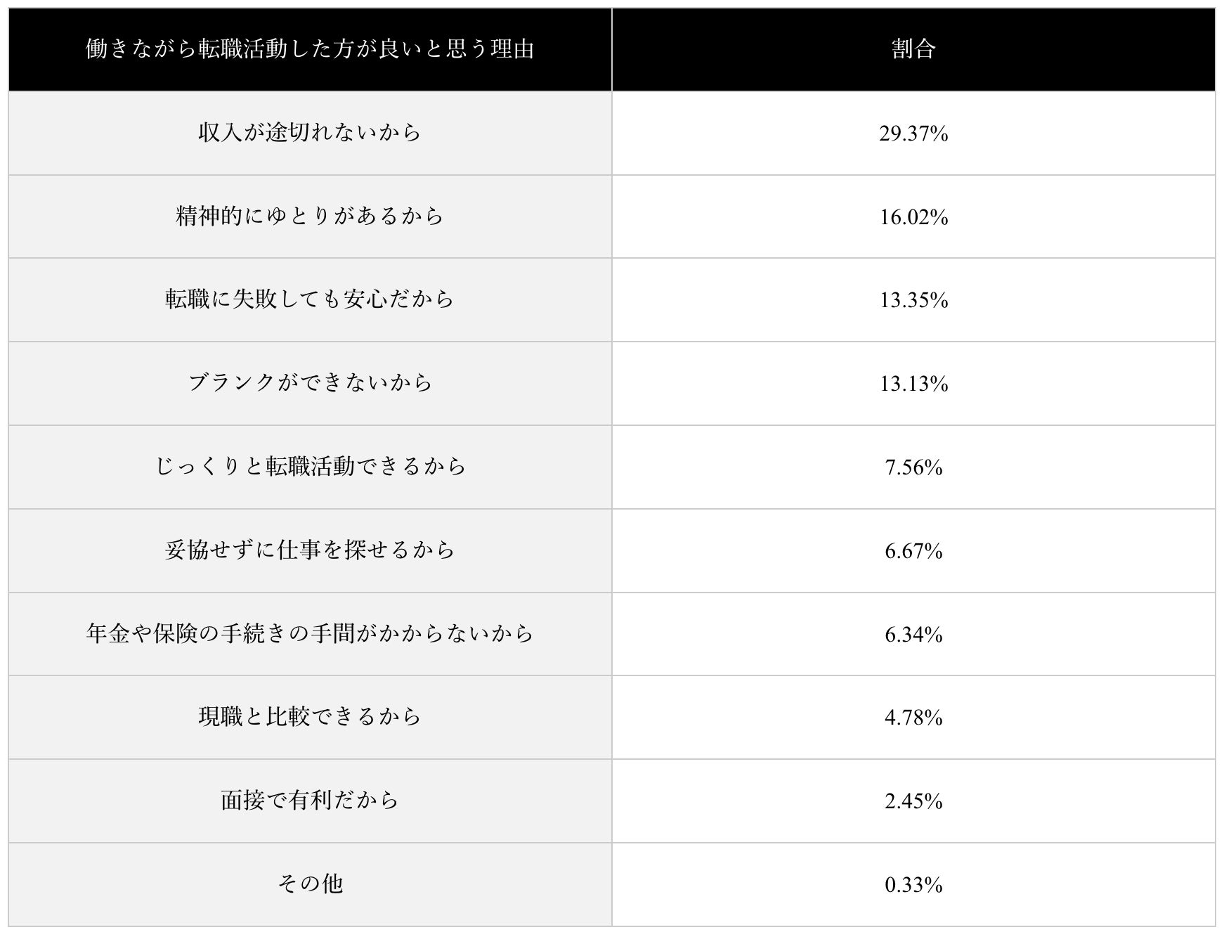 収入が途切れないことで精神的なゆとりが持てることや、現職に残ることもできるという理由で働きながら転職活動をする人が多いことが分かりました。