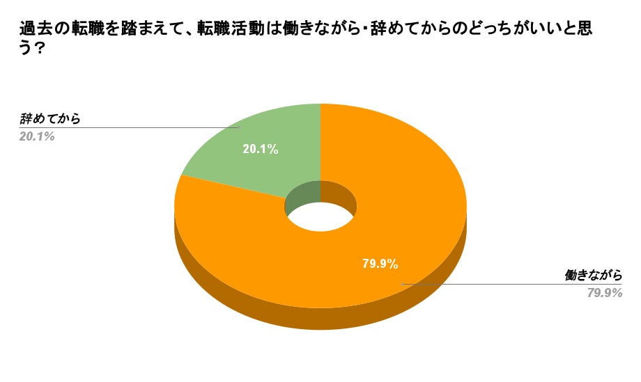 転職活動は「働きながら」と「辞めてから」のどちらがいいと思うかという質問に対して、全体の約8割が「働きながら」と回答しています。