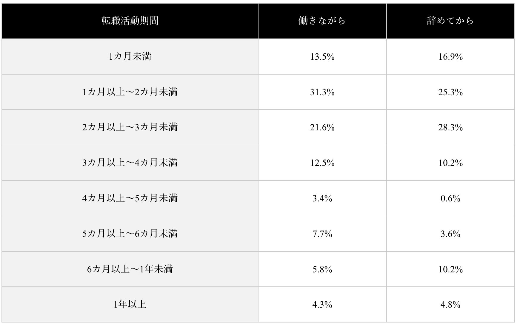 転職活動期間でみると、働きながらの人は1~2カ月以内、辞めてからの人は2~3カ月以内が多い