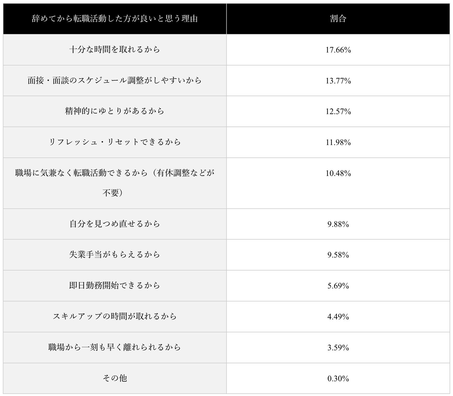 辞めてから転職活動した方が良いと思う理由の上位を占めたのは「十分な時間を取れるから」「面接・面談のスケジュール調整がしやすいから」「精神的にゆとりがあるから」という回答でした。