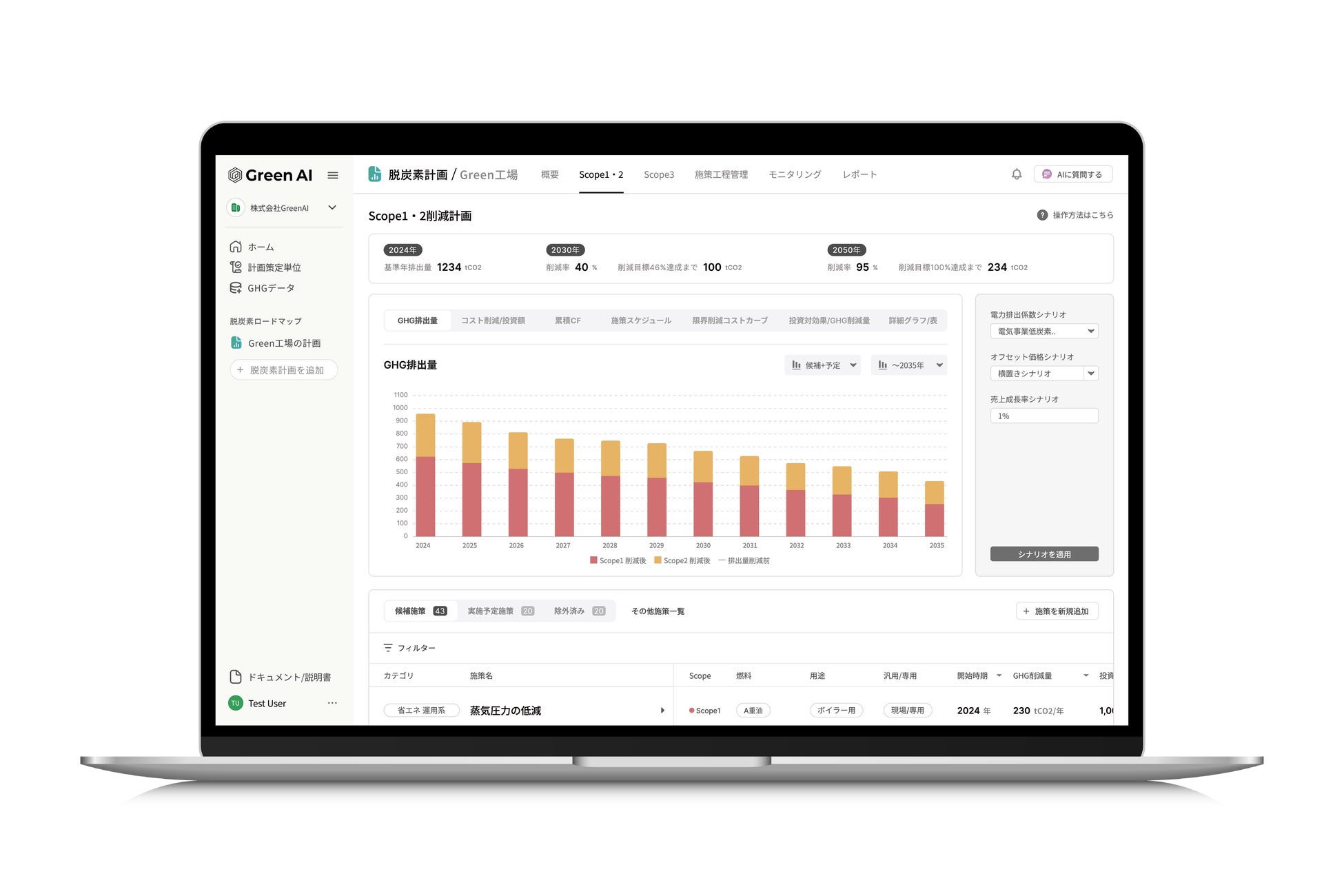 株式会社Green AIは、「環境(Green)」と「テクノロジー(AI)」を融合し、日本の脱炭素経営を推進するスタートアップです。弊社は、CO2削減ロードマップ策定システム『Green AI』を通じて、コスト削減と脱炭素の両立を支援します。