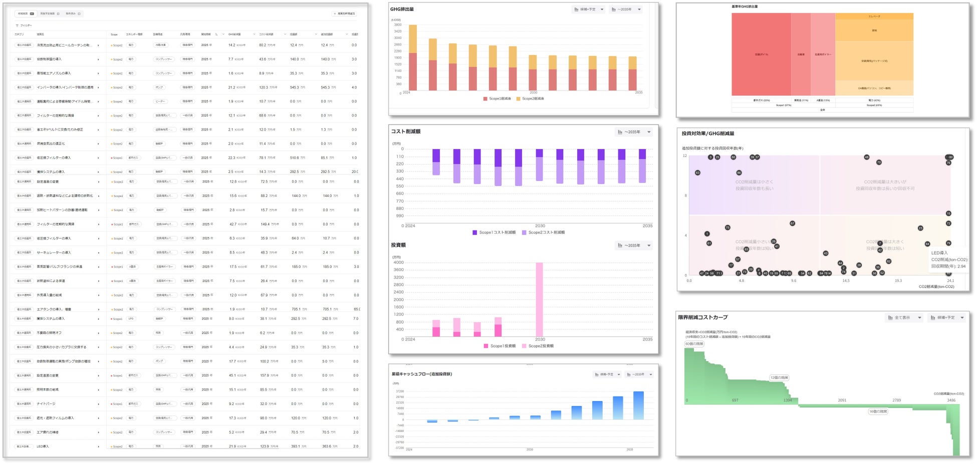 『Green AI』は、環境や設備に関する専門知識がなくても短時間で脱炭素化ロードマップを作成できるシステムです。1100以上の脱炭素・省エネ施策を網羅したデータベースから、ユーザー情報に基づいて最も経済的な施策を自動でレコメンドし、排出量削減計画を策定します。