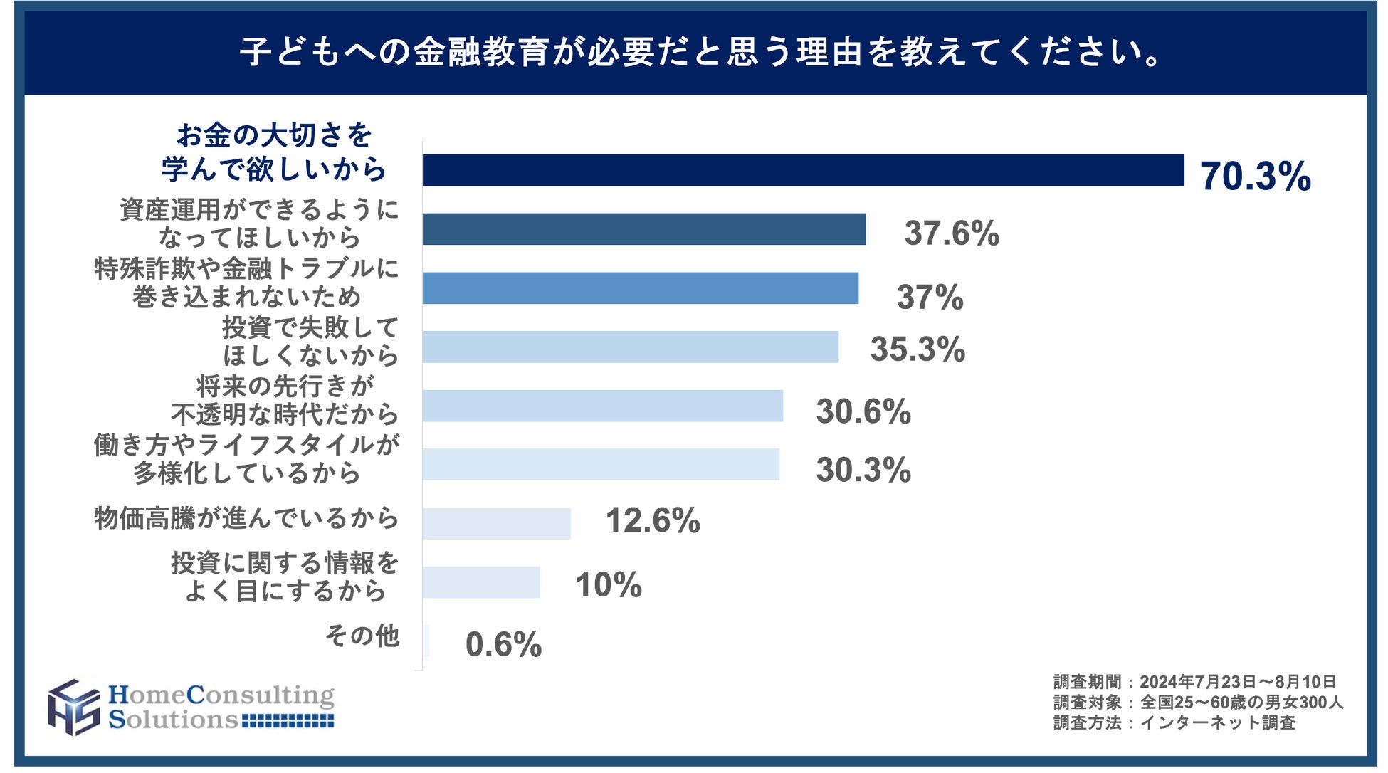 子どもへの金融教育が必要だと回答した方を対象に、金融教育が必要だと思う理由について聞いたところ、「お金の大切さを学んで欲しいから(70.3%)」と回答した方が最も多い結果となりました。その他の回答としては、「資産運用ができるようになって欲しいから(37.6%)」「特殊詐欺や金融トラブルに巻き込まれないため(37%)」などの回答が上位となりました。