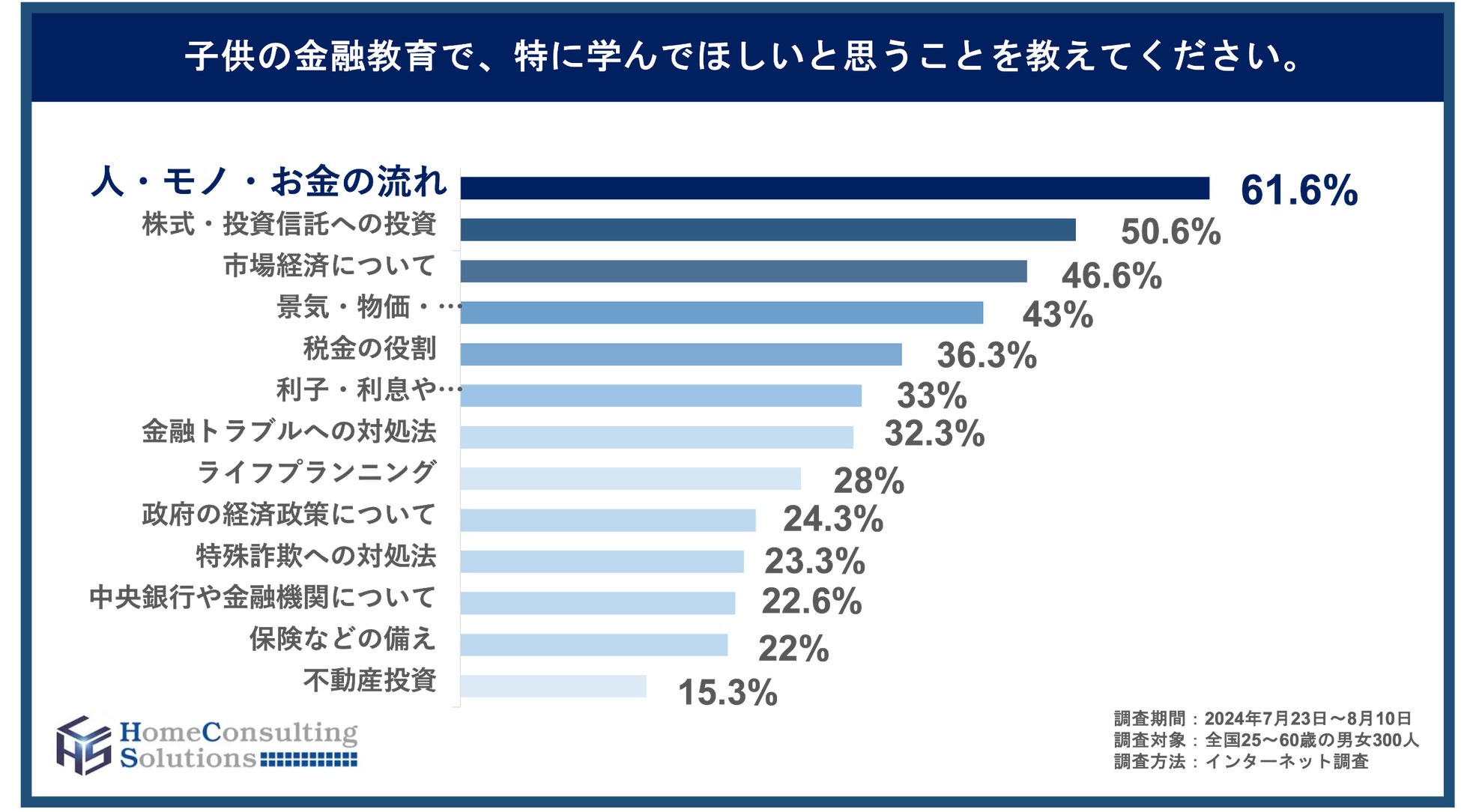 金融教育において、特に学んで欲しいと思うことについて聞いたところ、「人・モノ・お金の流れ(61.6%)」と回答した方が最も多い結果となりました。その他に多い回答として、「株式・投資信託への投資(50.6%)」「市場経済について(46.6%)」が上位となりました。