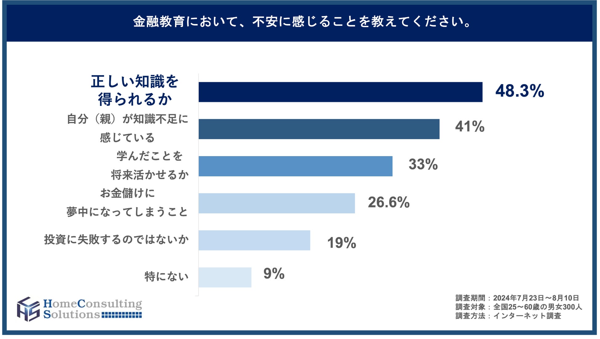 金融教育において不安に感じることを聞いたところ、「正しい知識を得られるか(48.3%)」「自分(親)が知識不足に感じている(41%)」が多い回答となりました。