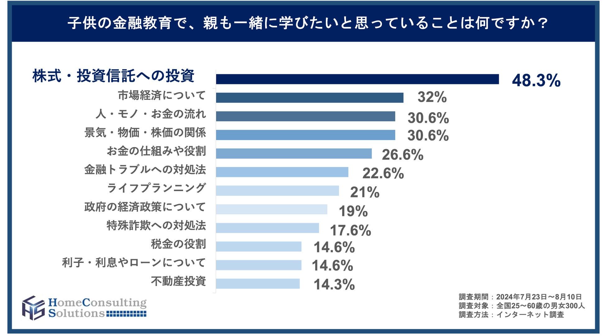 子供の金融教育で、親も一緒に学びたいことを聞いたところ、「株式・投資信託への投資(48.3%)」が最も多い結果となりました。次いで、「市場経済について(32%)」「人・モノ・お金の流れ(30.6%)」が上位の回答となりました。