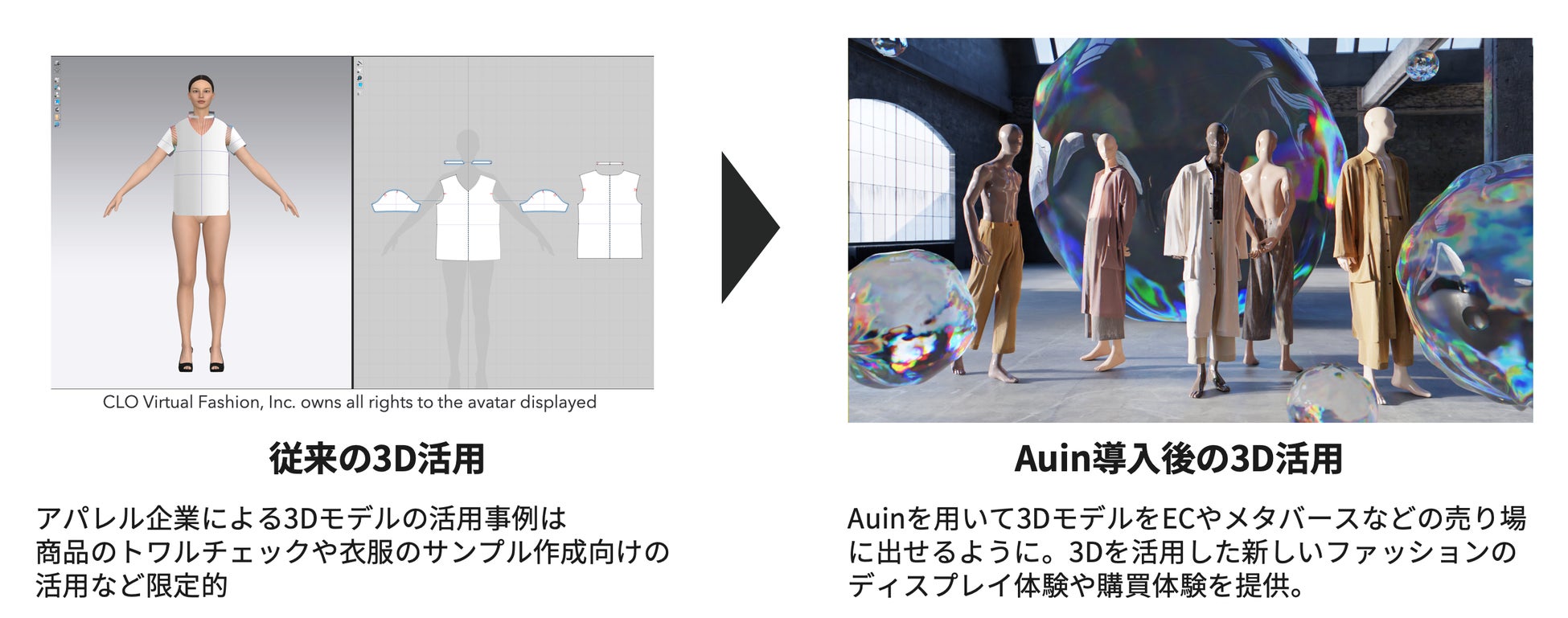 Auinは「3DCGの衣服を美しく見せるデジタルマネキン」をコンセプトとして、アパレル業界DXを加速させることを目標としています。3Dを用いたトワルチェックやサンプル作成に加え、その3DモデルをAuinに着用させてECに掲載することで、量産サンプルを待たずにECに商品を掲載することができます。それにより、リードタイムの短縮と在庫リスクの抑制の実現を目指します。将来的にはメタバースやXR領域における活用も見据え、売り場、新しいファッションのディスプレイ体験・購買体験を提供していきます。