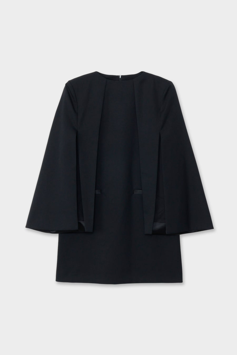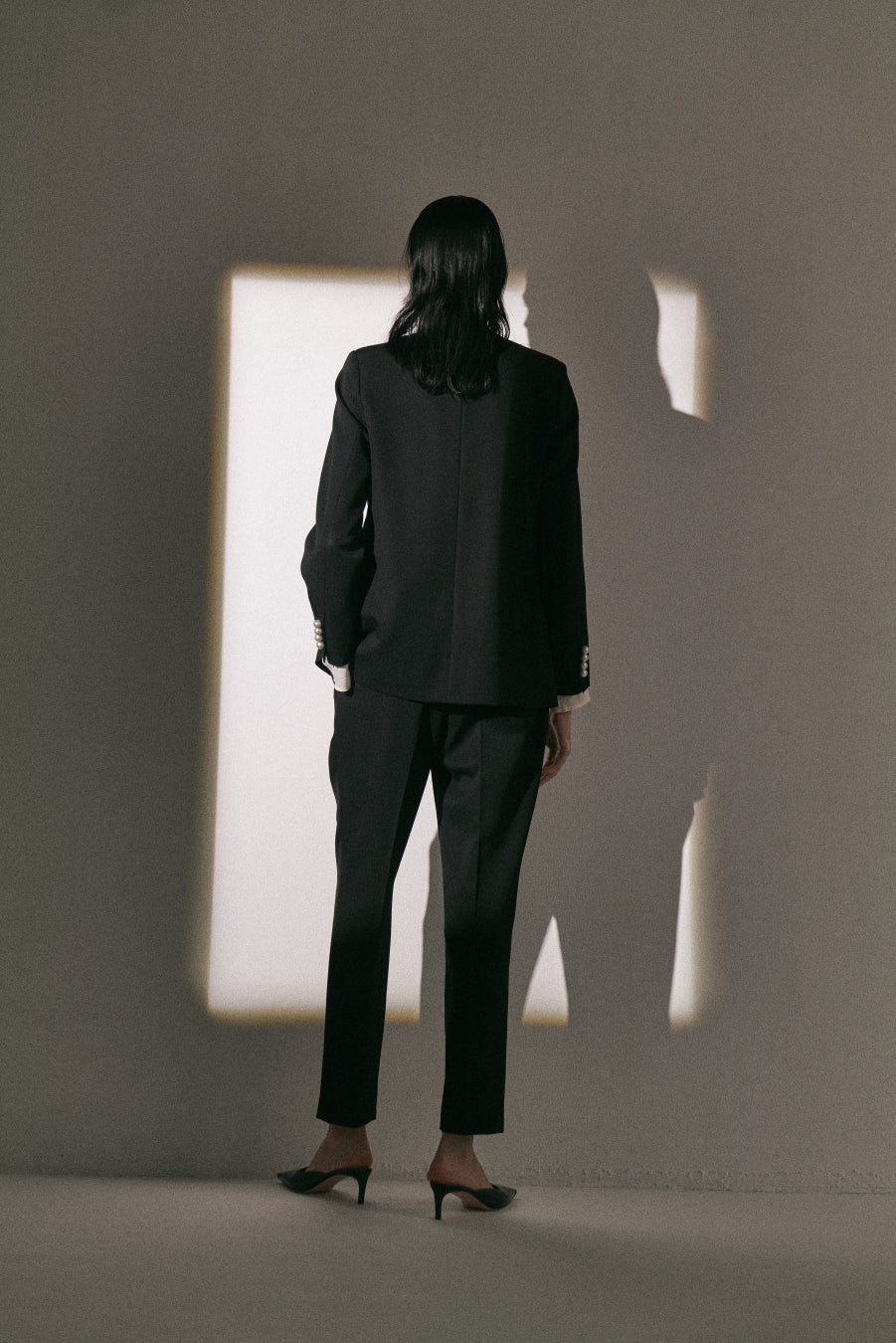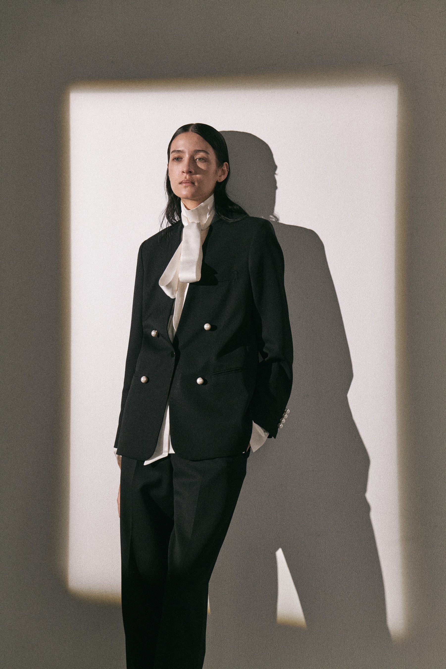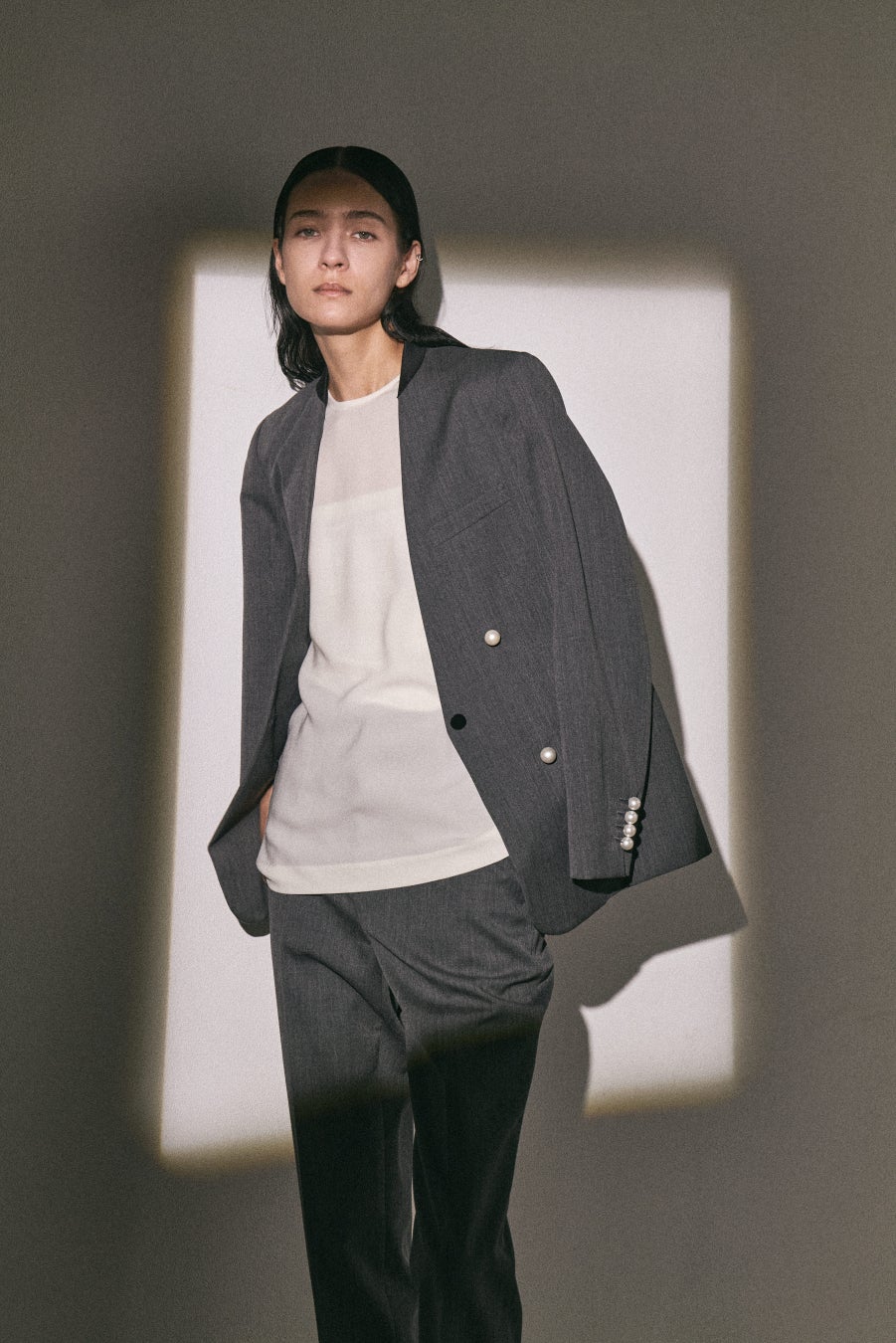 ノーカラーでシックに見えるディテールです。特別な日のジャケットとしてフロントの左右にはパール調ボタンを配置し、留のボタンは身頃同色でミニマルなボタンにすることでパールボタンを際立たせた仕様となっています。袖口もパール調ボタンにし後ろ姿からもエレガントさを醸し出す仕上がりにしています