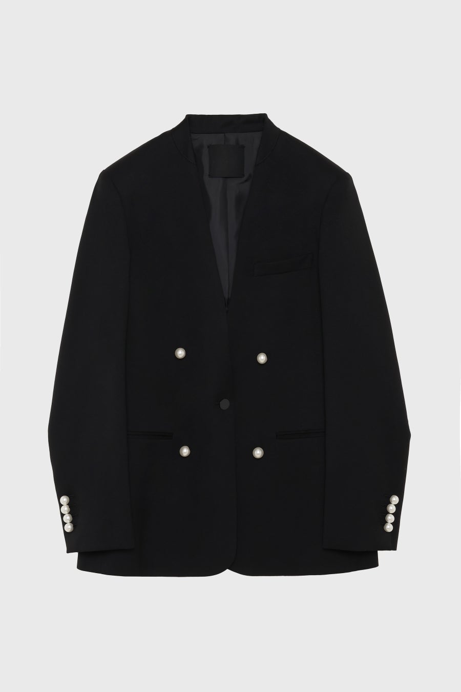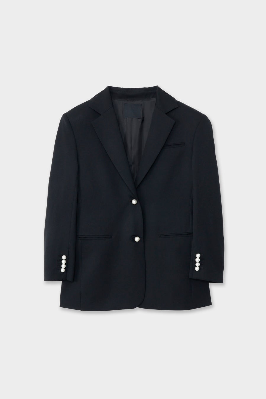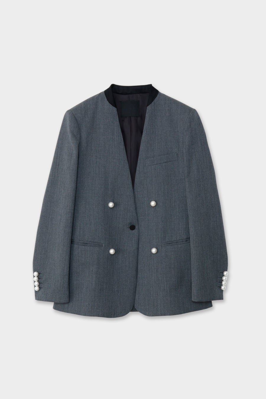 ノーカラーでシックに見えるディテールです。特別な日のジャケットとしてフロントの左右にはパール調ボタンを配置し、留のボタンは身頃同色でミニマルなボタンにすることでパールボタンを際立たせた仕様となっています。袖口もパール調ボタンにし後ろ姿からもエレガントさを醸し出す仕上がりにしています。