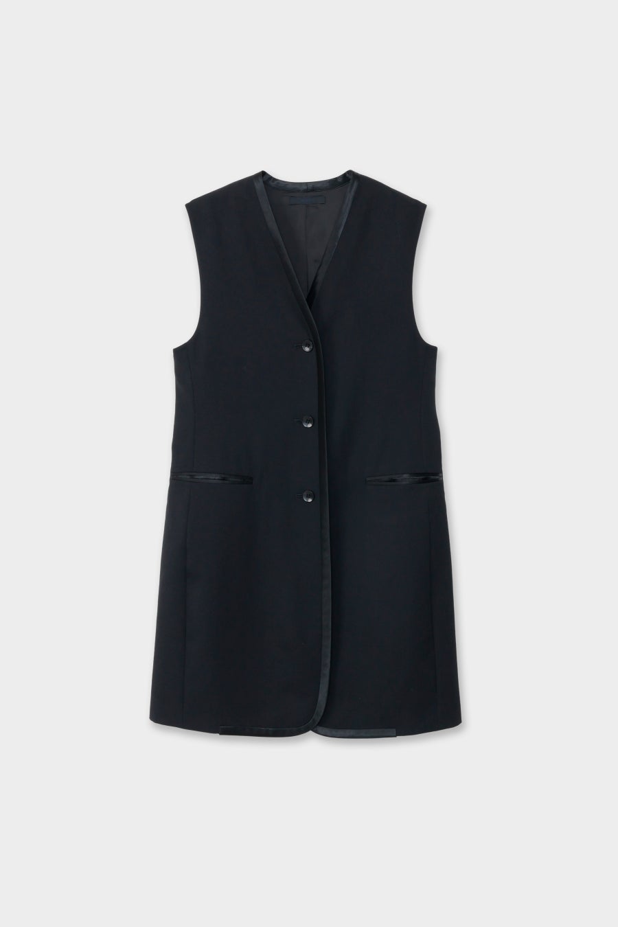 ジャケットの下に着用したさいに裾がでる、3ピースとしてのバランスを崩したロングジレ。襟ぐりはサテン生地でトリミングしエレガントな仕上がりとなっています。ジャケットを羽織らずブラウスなどにレイヤードした着こなしも可能なデザインです。