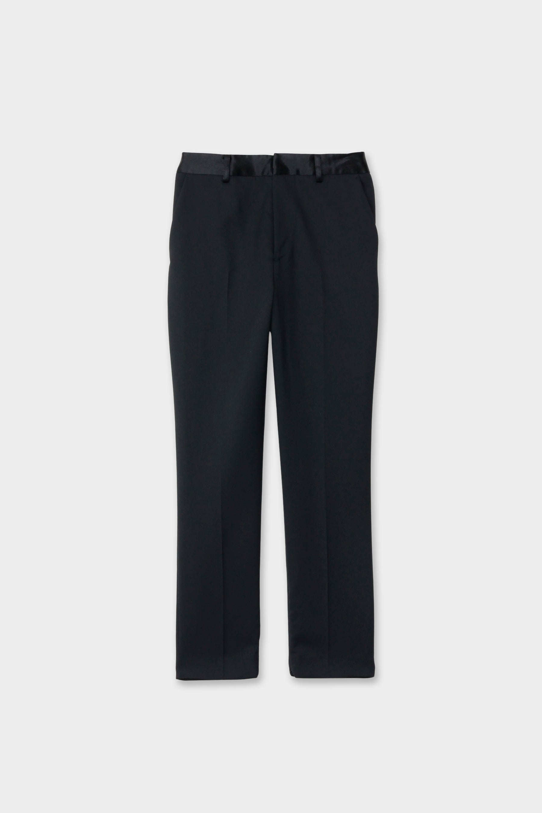 やや低めに設計されたウエストにはサテン素材を配し、穏やかな光沢が静かなコントラストを生み出します。ダーツ処理によってヒップまわりはすっきりと整え、裾のコンシールファスナーはスリットとしてのアレンジにも対応。