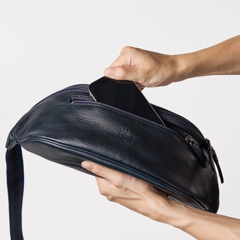 外装のポケット下段にはスマホを収納出来る様にデザインしました。ファスナータイプのポケットで中身を落とす心配はありません。現代用途を取り入れたお洒落なボディバッグです。写真ではiPhone15pro カバー付きを収納しています。