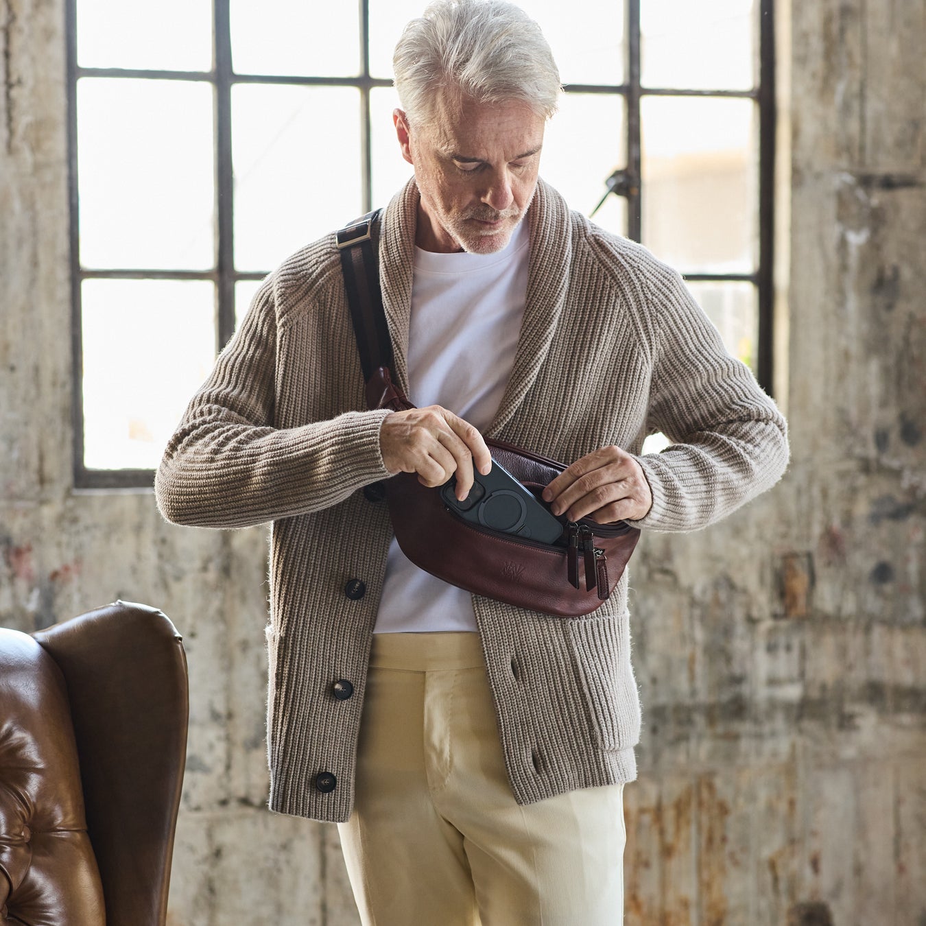 三日月から着想を得たデザインのMIKAZUKIバッグ。ココマイスター銀座店2階のコンセプトでもある三日月をボディバッグで表現。三日月らしいスタイリッシュにデザイン、そして身体にフィットする使用感が魅力です。重厚感のある英国純正オイルレザーを柔らかいラインに仕上げました。