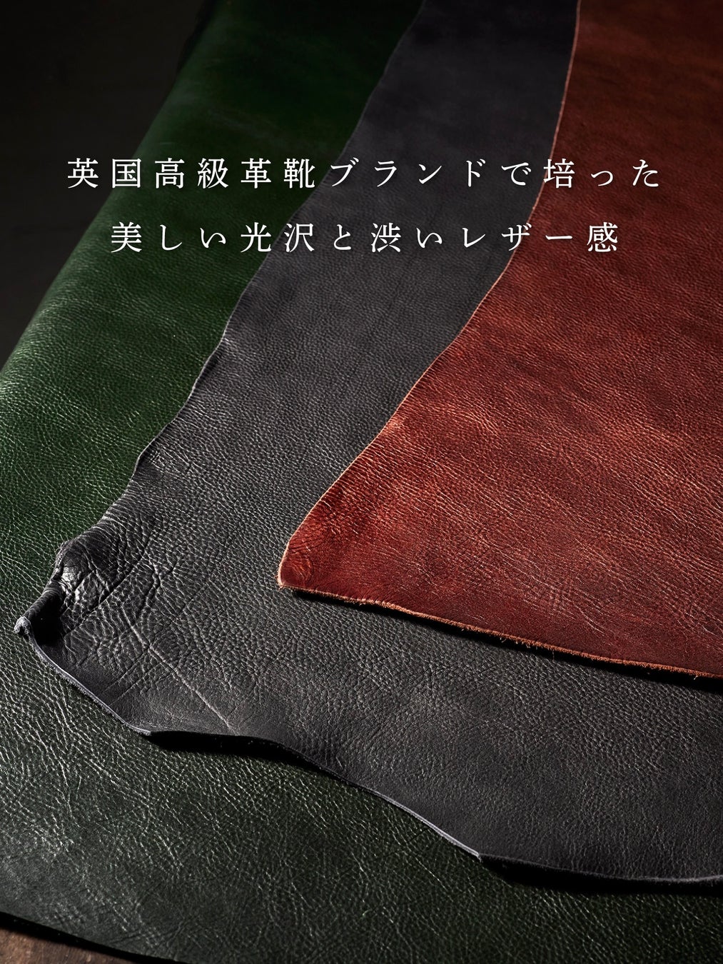 イギリスの高級革靴ブランドで特別な顧客からオーダーを受けるビスポークシューズで使用されるレザーを作り続けてきたタンナーが生み出した“英国純正”のオイルレザーです。靴用レザーより、質感と柔らかさを重視し、鞄や財布小物用の革素材を開発しました。高級革靴として磨かれた艶出し技術を駆使することで、美しいツヤ感を楽しめるのが魅力です。