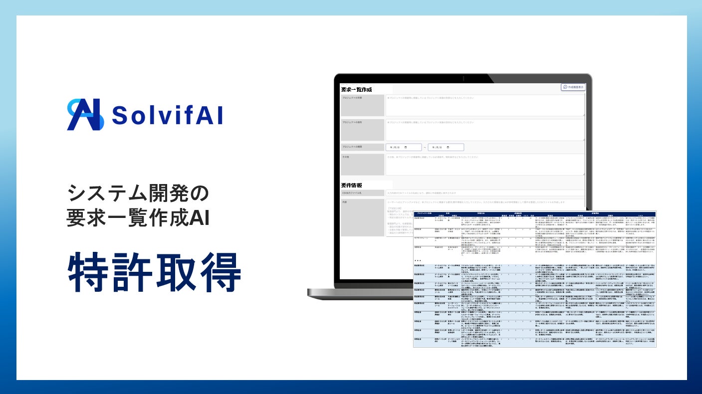 ソルビファイ株式会社(本社:東京都港区、代表取締役:CEO湯淺元祥/COO染谷凌大)は、抜け漏れ要件洗出し・実現手段策定・優先順位評価を自動化する「要求一覧作成AI」特許を取得いたしました。