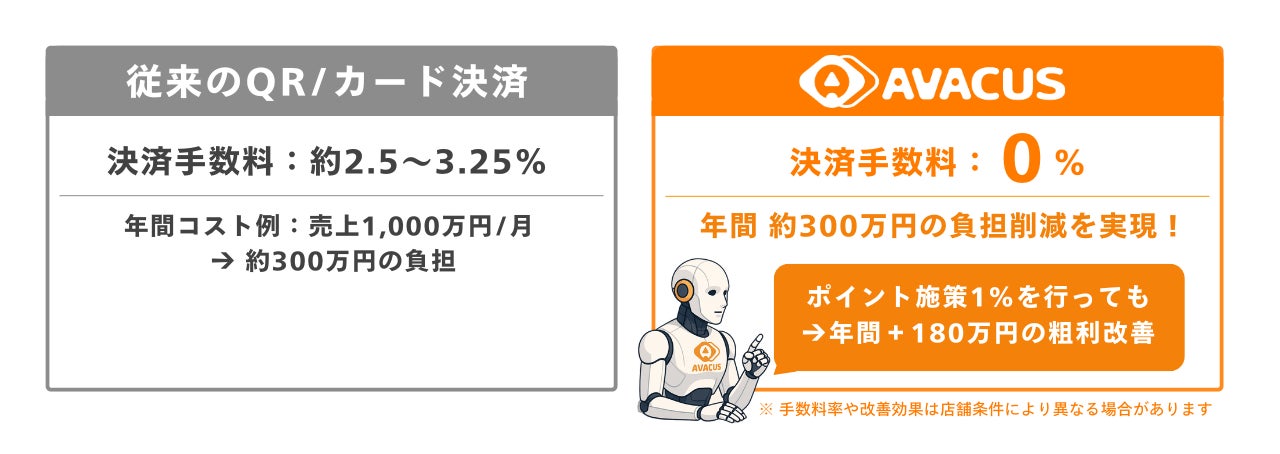 従来のQR・カード決済 (約2.5〜3.25%) と比較して、決済手数料0%!