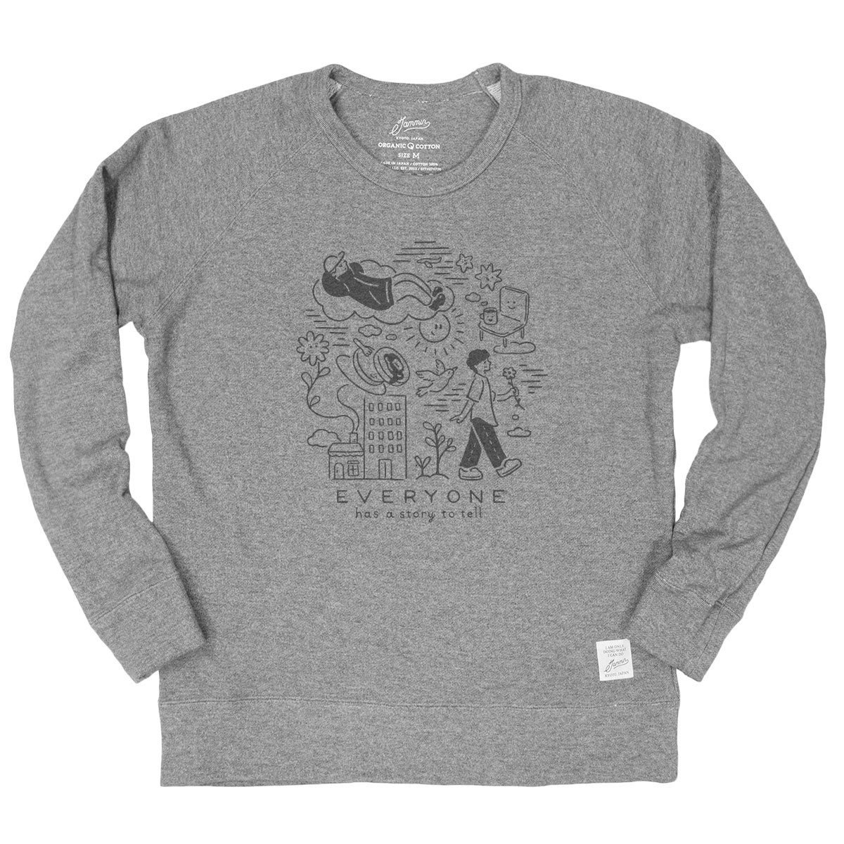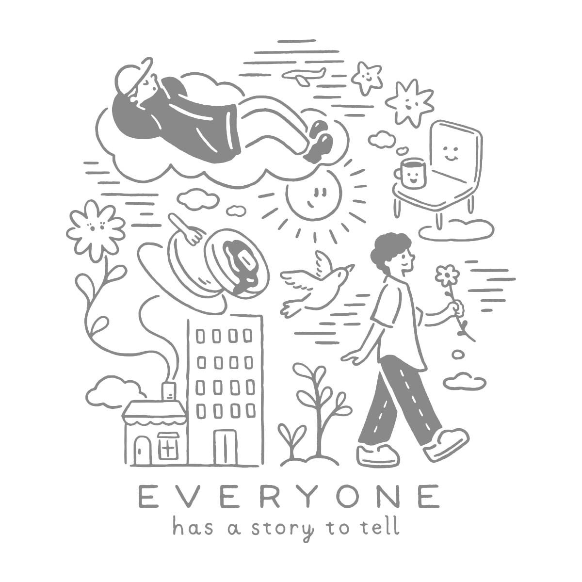 グラフィックには、「EVERYONE has a story to tell(誰もが語るべき物語を持っている)」というメッセージが添えられています。上部には雲の上で寝転ぶ人物、歩いて花を持つ人物、空を飛ぶ飛行機や鳥、日常を象徴するコーヒーカップやビル群などが描かれており、一見バラバラに見えるこれらのモチーフが、人生の豊かさや多様性、そして一人ひとりのストーリーの存在を象徴しています。