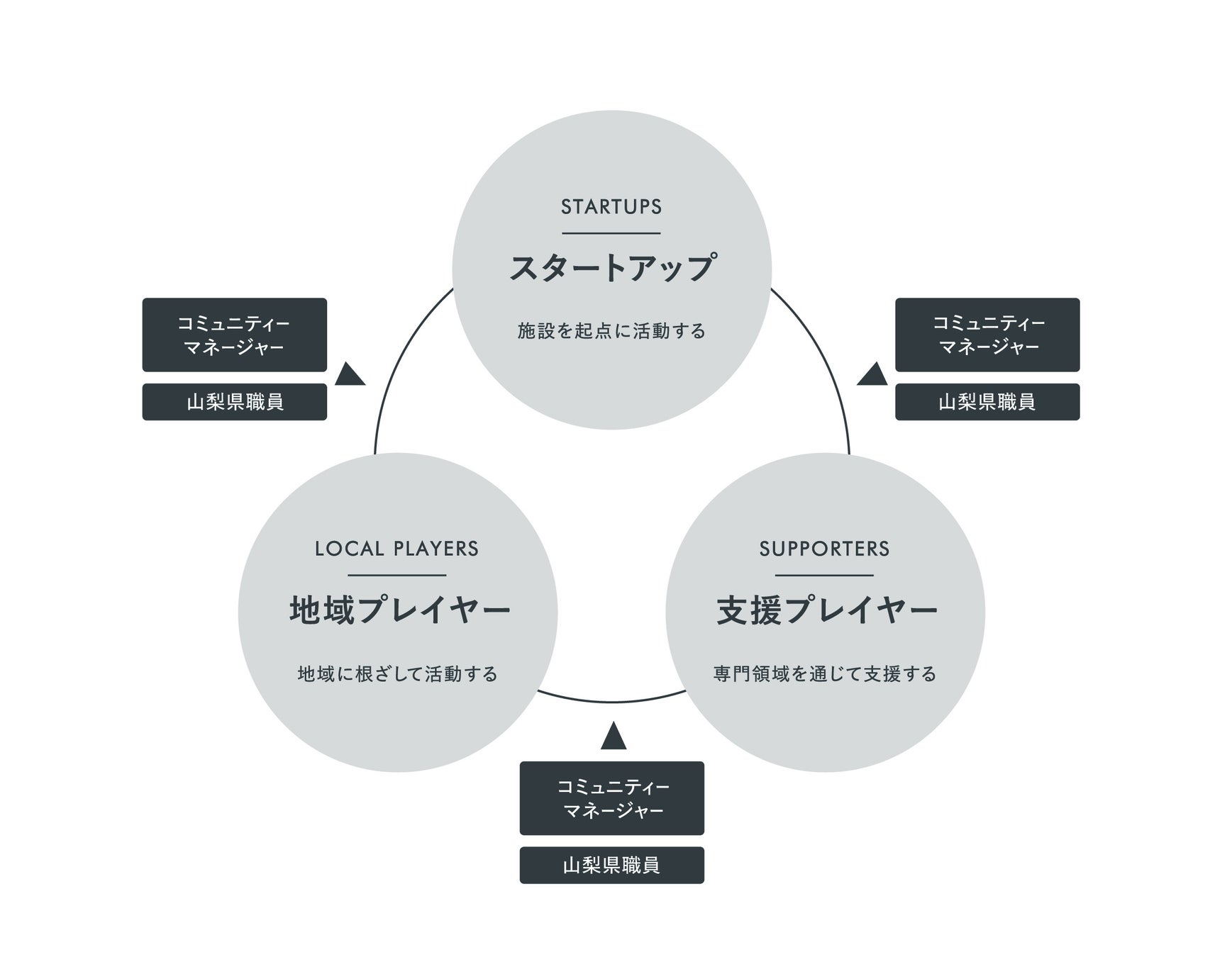 支援拠点では、単にスタートアップを事業的に支援するだけでなく、山梨県の人や情報、同じ志を持った起業家が集まり、県内で事業を展開していく上で必要不可欠なローカルネットワークのハブとなることを目指し、拠点に付随するコミュニティの形成に力を入れているのが特徴です。