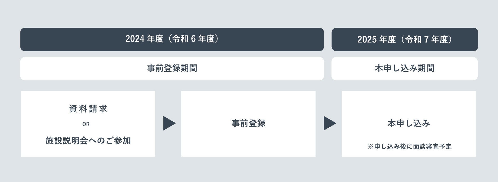 資料請求のお申込み、もしくは施設説明会へご参加頂いた後、担当者より事前登録のご案内をいたします。