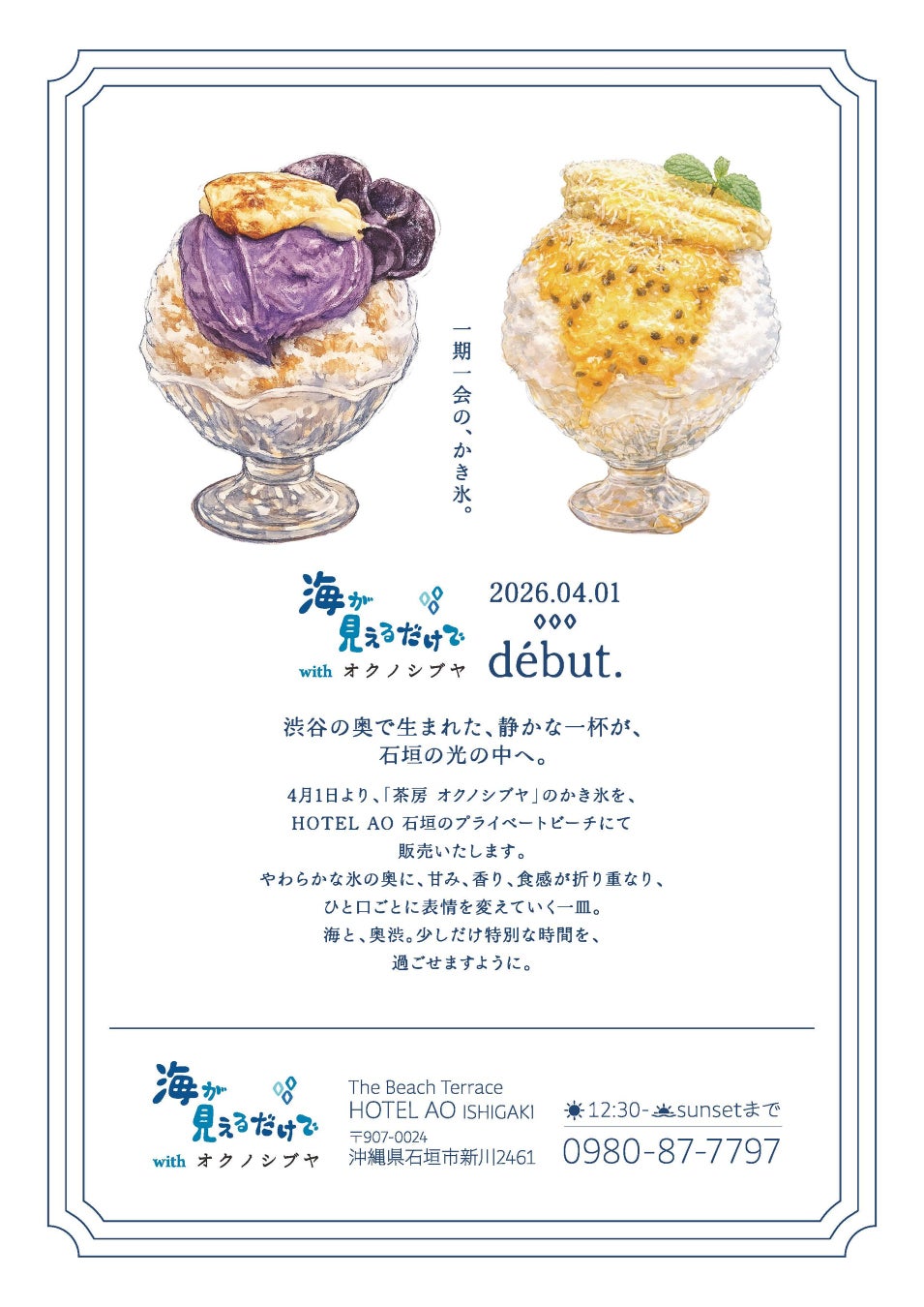 沖縄・国際通りの中心地である久茂地に「oceangood OKUSHIBU」、石垣島に「海が見えるだけで with OKUNOSHIBUYA」の2店舗を同時オープン。単なるスイーツではなく、“その場でしか味わえない体験”として、新たなかき氷の価値を発信してまいります。