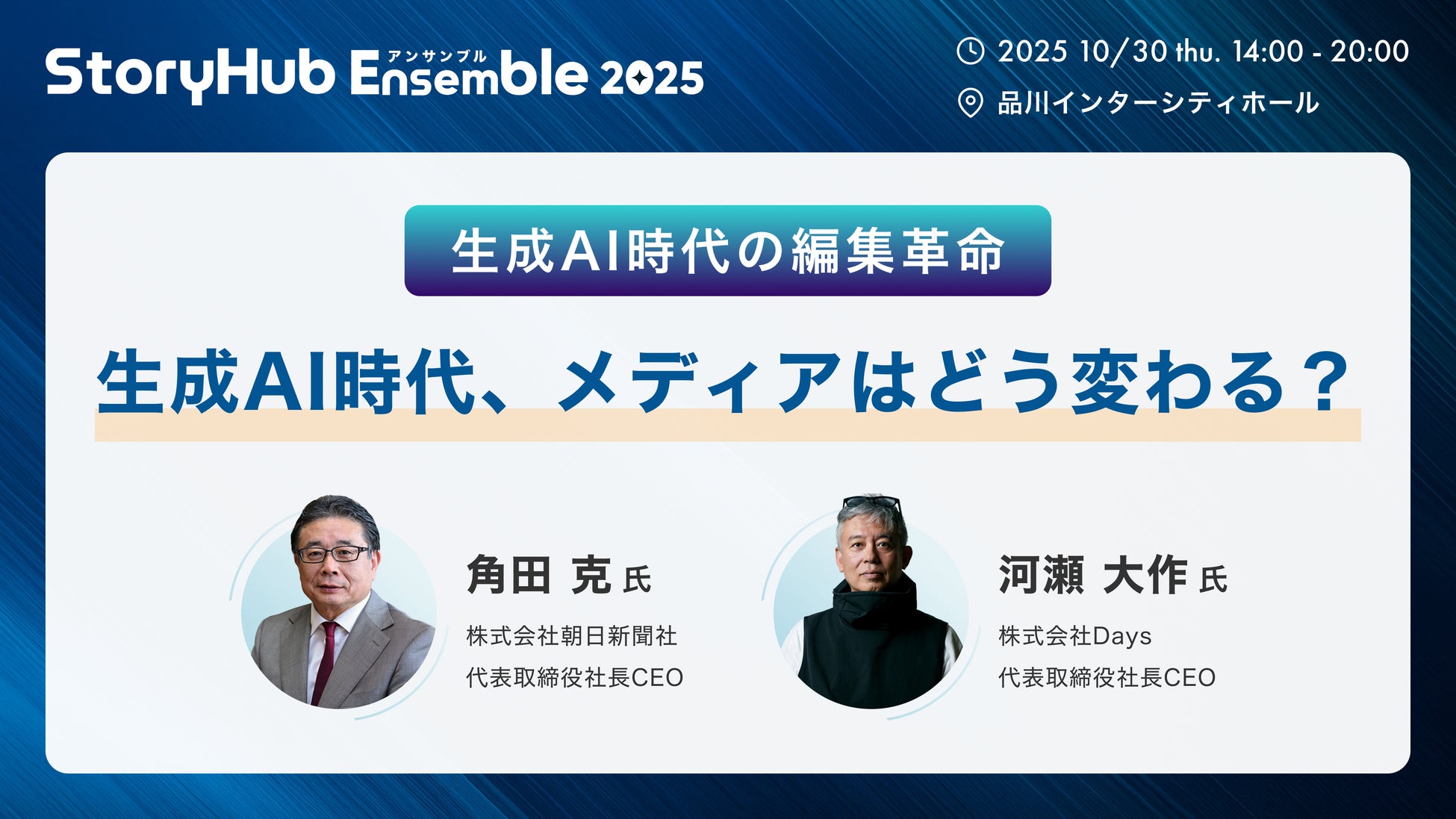 また、2025年10月30日(木)開催のメディア担当者向け大型AIカンファレンス「StoryHub Ensemble 2025」では、基調講演で朝日新聞社 社長CEOの角田 克氏に登壇いただく予定です。