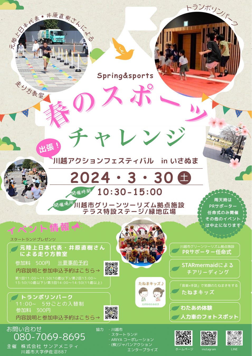 川越市グリーンツーリズム拠点施設では、2024年3月30日(土)に 春のスポーツチャレンジ ~川越アクションフェスティバル in いさぬま を開催します!