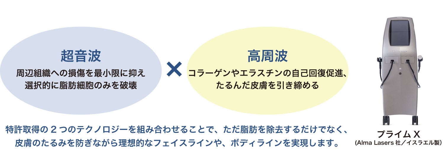 美しいシルエットをつくるためには、ただ脂肪を除去するだけでなく、皮膚の引き締めを同時に行うことが重要です。なぜなら、脂肪のみを取り除くと皮膚が余り、たるみやシワが生じる可能性が高まるからです。今回、新しくメニューに加わる『プライムX[小顔ウルトラ]』『プライムX[部分痩せウルトラ]』は、特許取得の超音波と高周波(RF)技術で脂肪除去と皮膚の引き締めを同時に行うことで、理想的なシルエットとハリのある美しい肌を実現します。