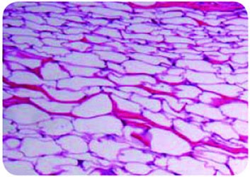 ①照射前は、脂肪細胞膜がハッキリ見えます。脂肪細胞は膜に覆われ、中に液体の脂肪を蓄えています。