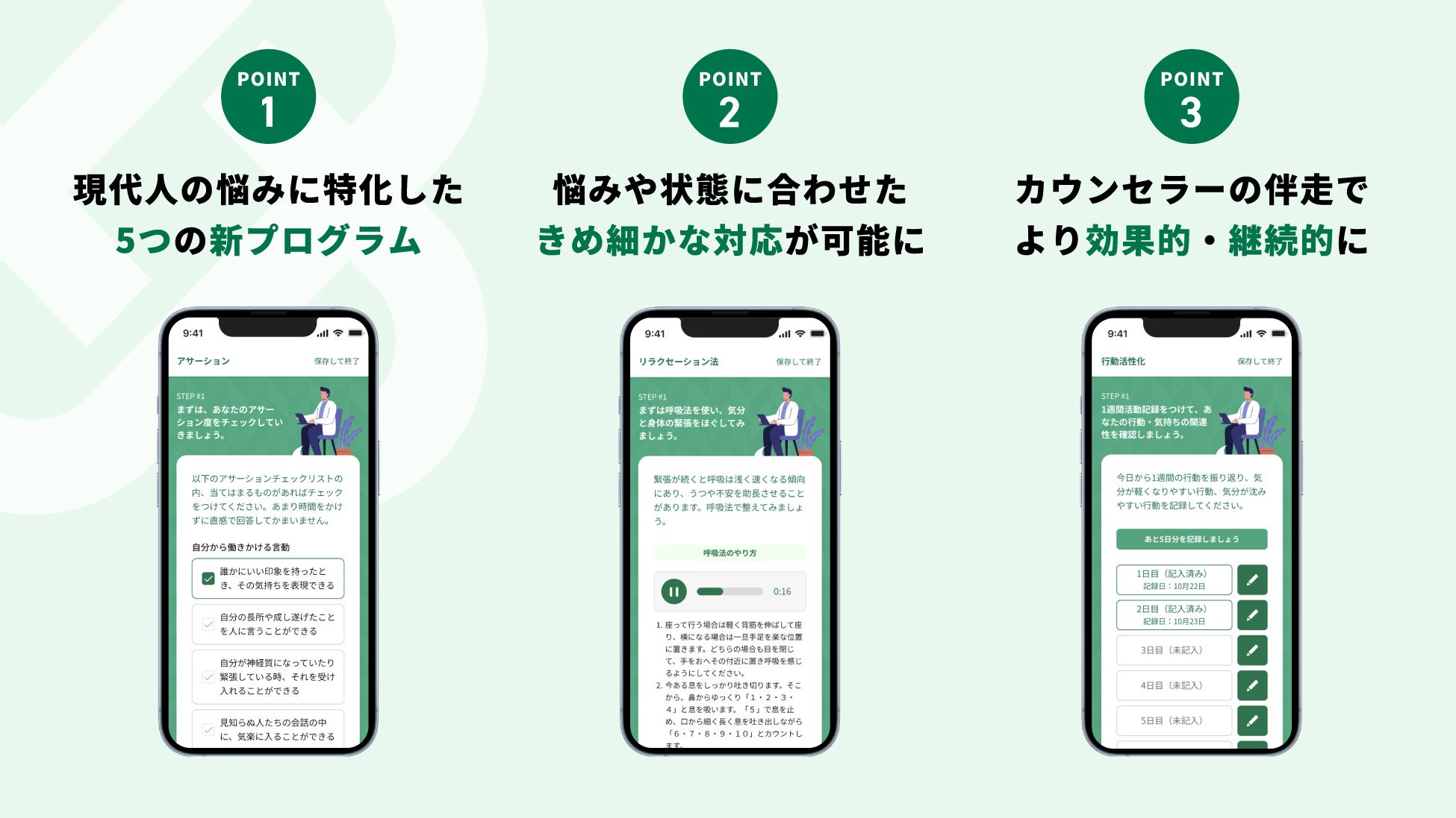今回、より幅広いお悩みやお困りごとに対応するため、「アサーション」「セルフ・コンパッション」「リラクセーション法」「気分のモニタリング」「行動活性化」の5つのワークを、公認心理師/臨床心理士監修のもと作成し、リリースいたしました。