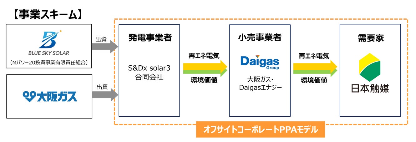 発電事業者・小売電気事業者・需要家でオフサイトコーポレートPPA*2を締結し、本発電所で発電された電気は大阪ガスが全量買い取り、大阪ガスの代理店であるDaigasエナジー株式会社(以下「Daigasエナジー」)を通じて、環境価値とともに株式会社日本触媒に供給します。