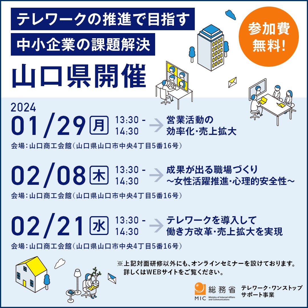 総務省 テレワーク・ワンストップ・サポート事業 地域窓口事務局(受託者:有限責任監査法人トーマツ)は、山口県で全3回にわたりテレワークの推進のためのセミナーを開催いたします。