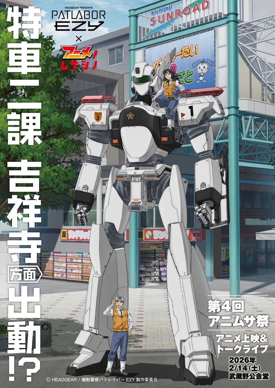 2026年2月14日(土)に開催(開催時間未定)。1988年より始まったメディアミックス作品『機動警察パトレイバー』シリーズとコラボした上映会、トークイベントを開催します。開催地は昨年から引き続き武蔵野公会堂(吉祥寺)。開催地となる吉祥寺と『機動警察パトレイバー EZY』の関係とは!?