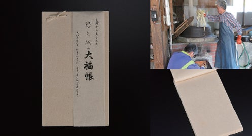 贈賞式には、私どもの100年前の大福帳をお持ちしました。2013年から、これに倣った新しいものを作り始めましたが、100年前のものと今作ったものの見た目は全く変わりません。一般的なパルプの入った紙は、最初は真っ白ですがだんだん黄ばんでいきます。楮100%の紙は、光にあたるとだんだん白くなります。