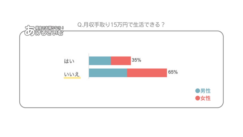 さて、本アンケートの大きなテーマである「月収手取り15万円で生活できる?」という質問に対し、全体の約65%は「月収手取り15万円では生活できない」と回答。