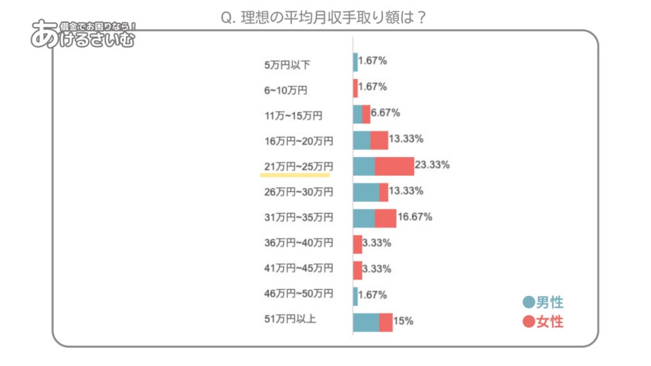 平均月収手取り額は、「16万円~20万円」が最多割合だったことから、多くの回答者は今の収入よりも約5~10万円の給与アップを願っていることが分かります。