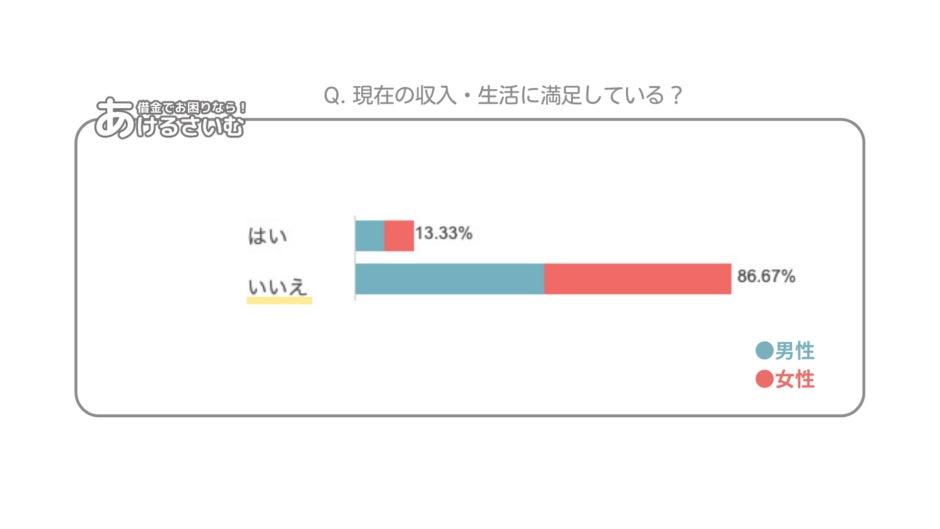 「現在の収入・生活に満足している?」という質問に対して全体の約86%がいいえと回答。