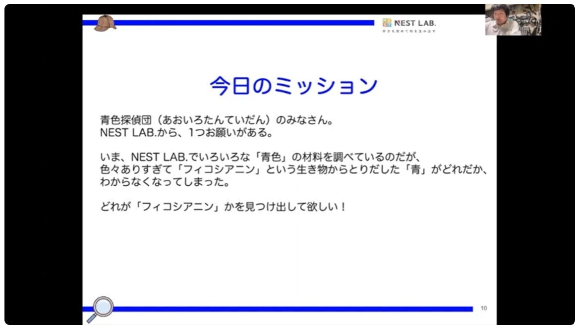 当社が豊富に保有しているオンライン実験教室プログラムのうち、品質管理に関する事業を展開する日科技連様には、「青色鑑定団-『青色探偵団─微生物がつくる青色色素「フィコシアニン」の秘密を解き明かせ』」のプログラムを提供いたしました。