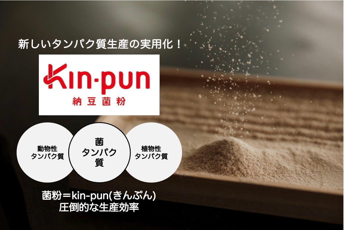 納豆菌を、 地球に寄り添った新タンパク質食材ブランドとして立ち上げたのが「kin-pun」です。 納豆菌そのものには、日本の伝統的発酵食品として世界中で食べられてきた長い食経験と歴史があります。また、納豆菌は生産効率が極めて優れており約30〜60分で2倍量になります。「kin-pun」は、パンや麺、菓子、ドレッシングに使うことで摂取タンパク質量を増やすことが可能であり、香りや食味においても楽しむことができます。