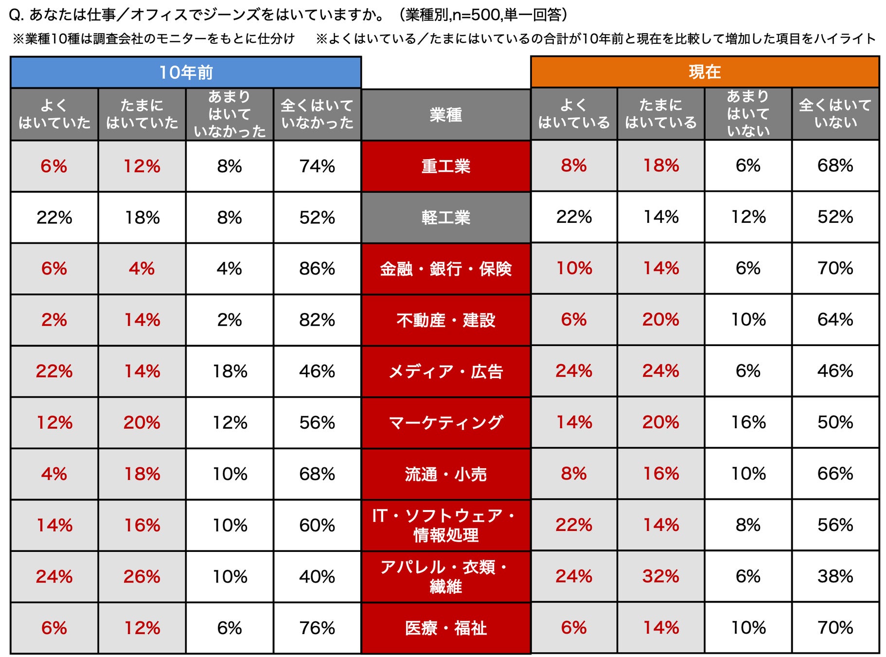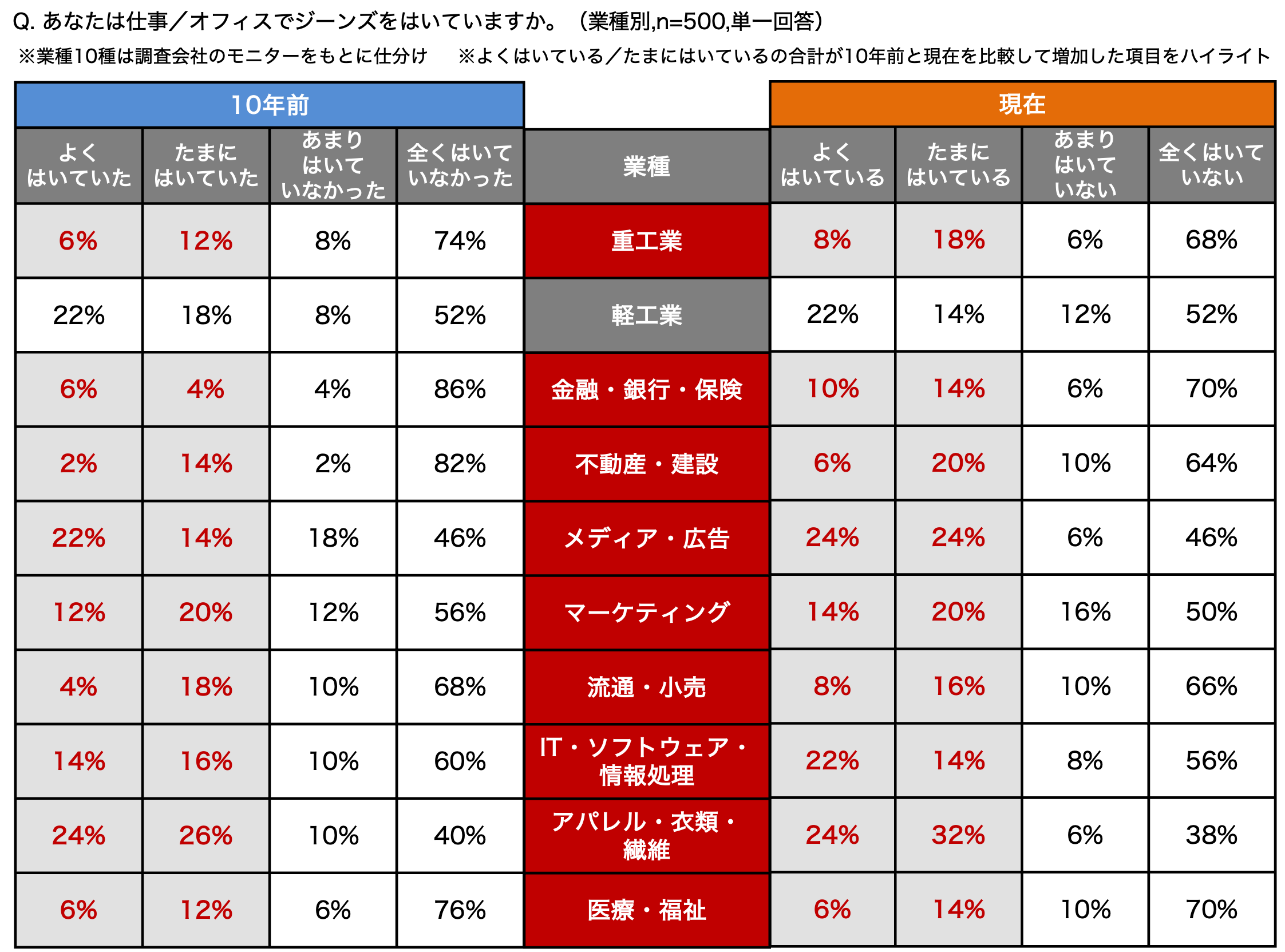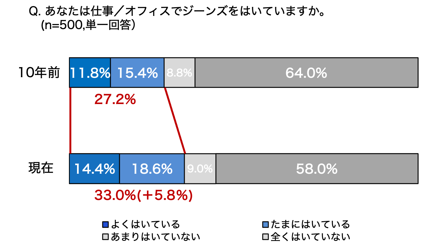 また、実際のオフィスでの着用意向を聞いたところ、現在では全体の3割以上(33.0%)がジーンズをオフィスで着用していることがわかり、10年前と比較すると、10業種中9業種でジーンズの着用率が増加していることも明らかとなりました。