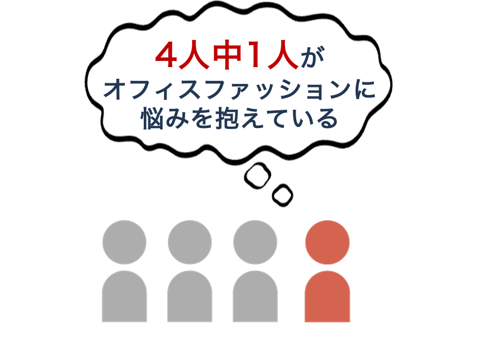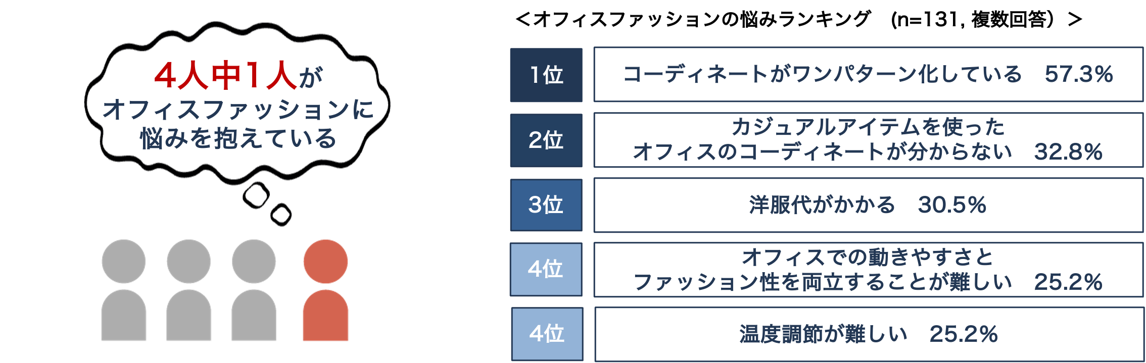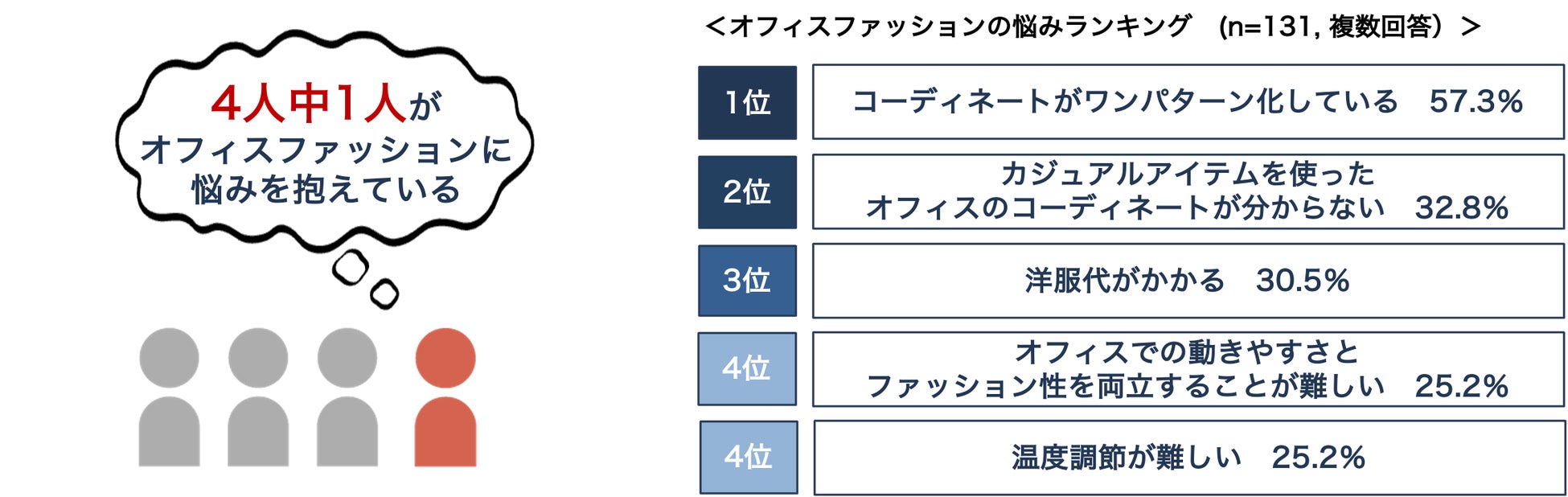 オフィスファッションで悩んでいる人は約4人に1人いることが判明。悩んでいることTOP3は「コーディネートがワンパターン化している」、「カジュアルアイテムを使ったオフィスのコーディネートが分からない」、「洋服代がかかる」という結果に。