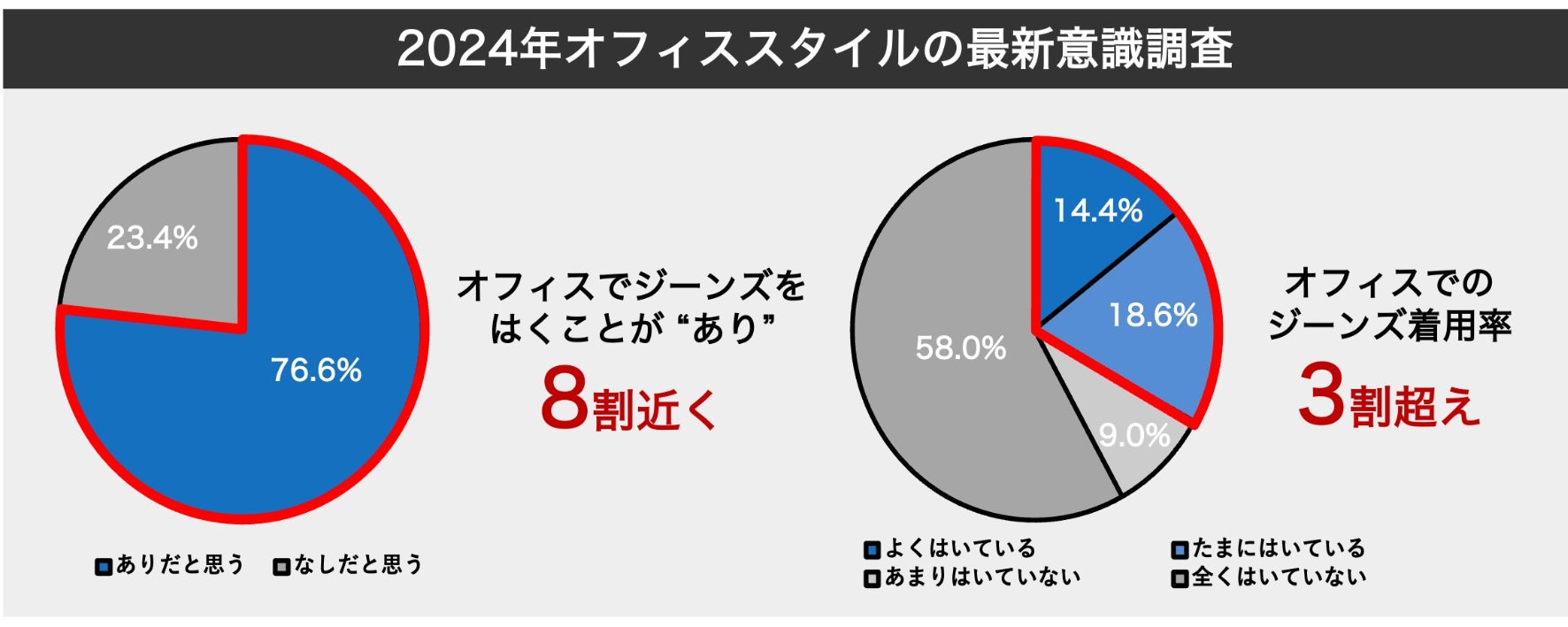【調査概要】 調査期間:2024年2月8日〜2月15日 調査テーマ:オフィススタイルの変化とジーンズに関する意識調査 調査対象者:関東在住、10年間同じ業種の企業に勤めている30〜50代の会社員、男女500名 調査方法:インターネット調査 |