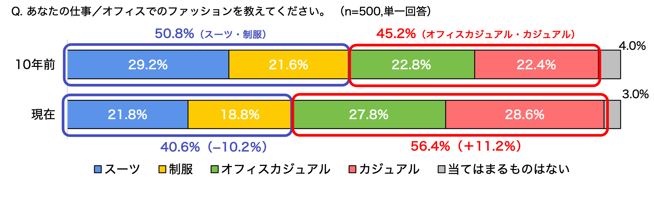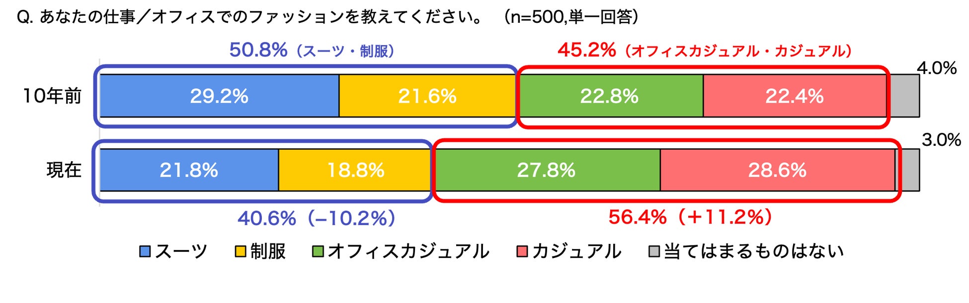 本調査を通して、10年前と現在のオフィスファッションを比較すると、10年前は「スーツ」や「制服」など決められたスタイルが多かったのに対し、現在では「カジュアル」や「オフィスカジュアル」など自由度の高いスタイルが、オフィスファッションの主流であることが明らかになりました。
