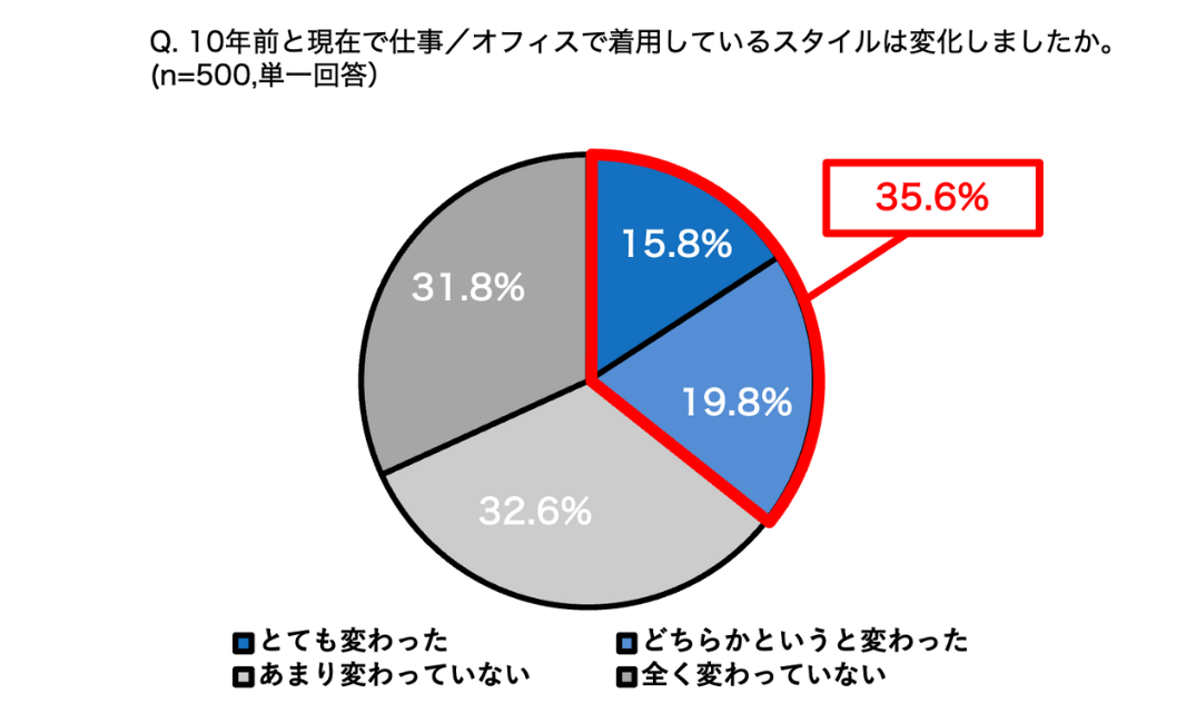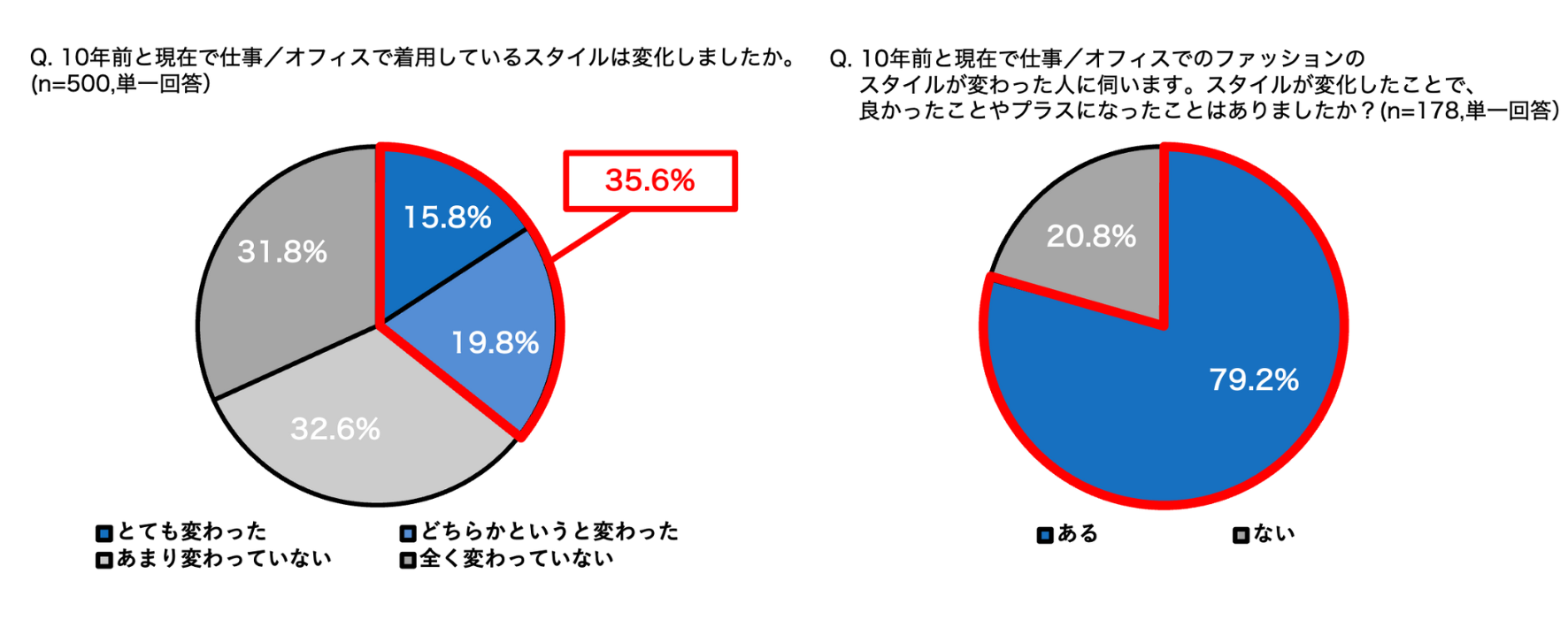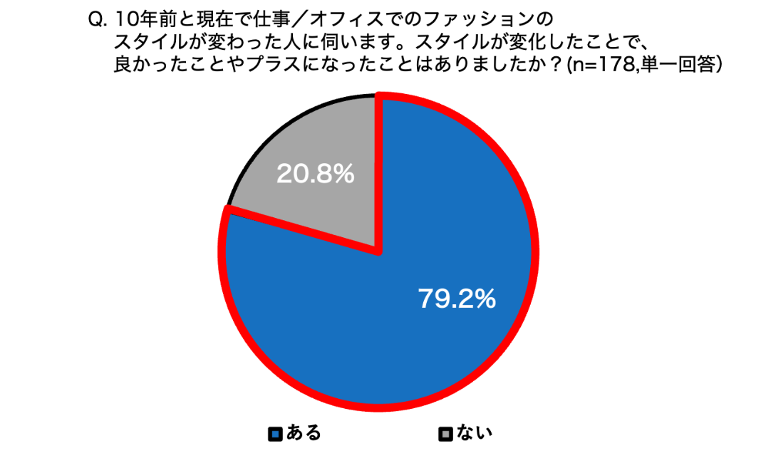 10年前と現在で仕事やオフィスで着用しているスタイルの変化があったかを聞くと、約3人に1人(35.6%)が変化したと回答。スタイルが変化した人に対して、変化したことで良かったことやプラスになったことが「ある」と回答した人は約8割(79.2%)という結果になりました。
